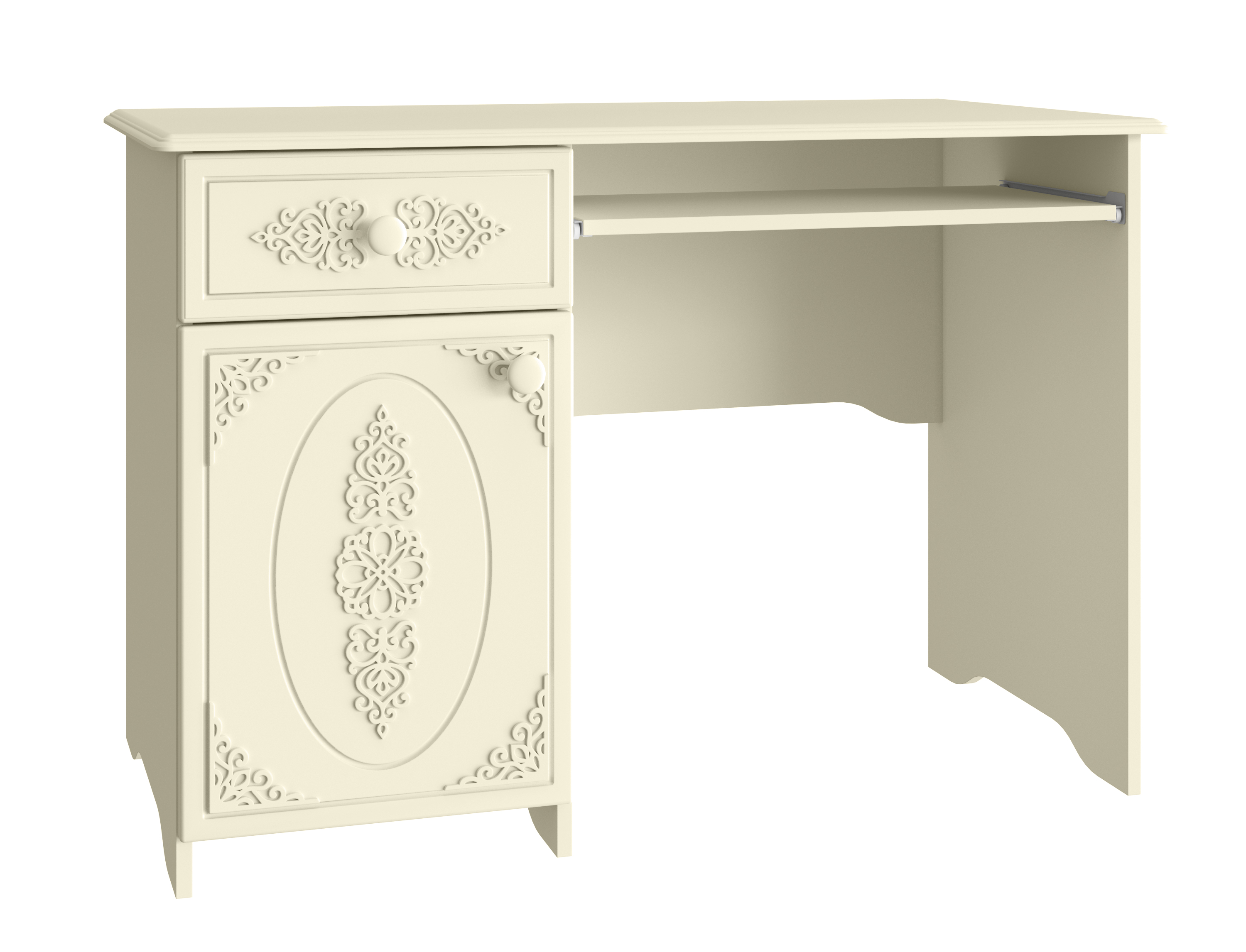 Стол компьютерный/письменный АС-242К из изысканной коллекции модульной мебели "Ассоль" может служить как письменным, так и компьютерным, дополнив его полкой под книги АС-14, АС-15 можно создать полноценное рабочее место. Стол снабжен полкой, одним выдвижным ящиком и полкой под клавиатуру. 3D накладки, которые украшают фасады, уравновешиваются лаконичным дизайном ручек. Модуль может быть собран "правым" или "левым". Размер выдвижной панели: 600х300х16мм. Ширина тумбы с ящиками 400 мм. Фурнитура: телескопические направляющие полного выдвижения без доводчиков, ручки пластик, петли с доводчиками.