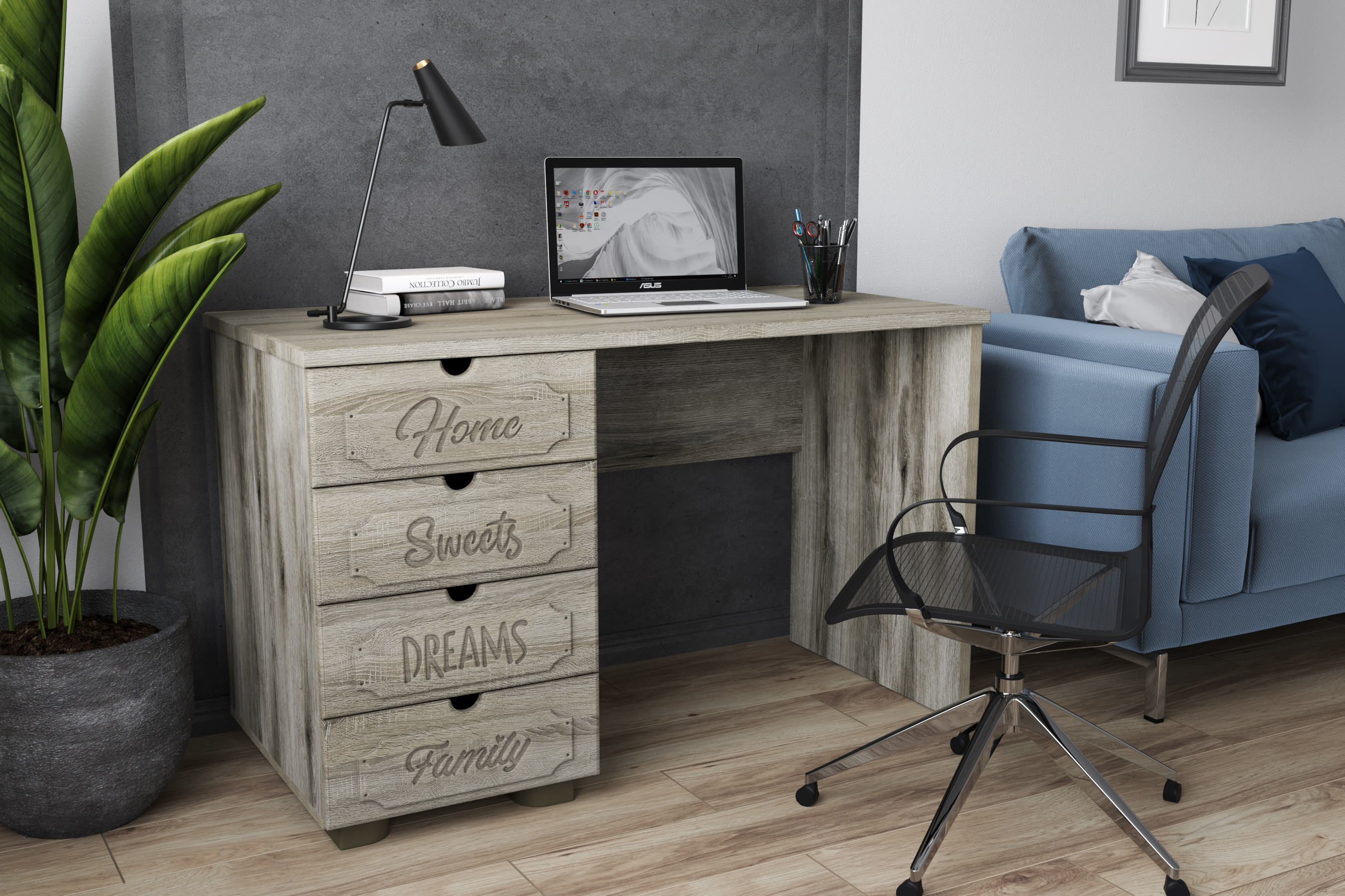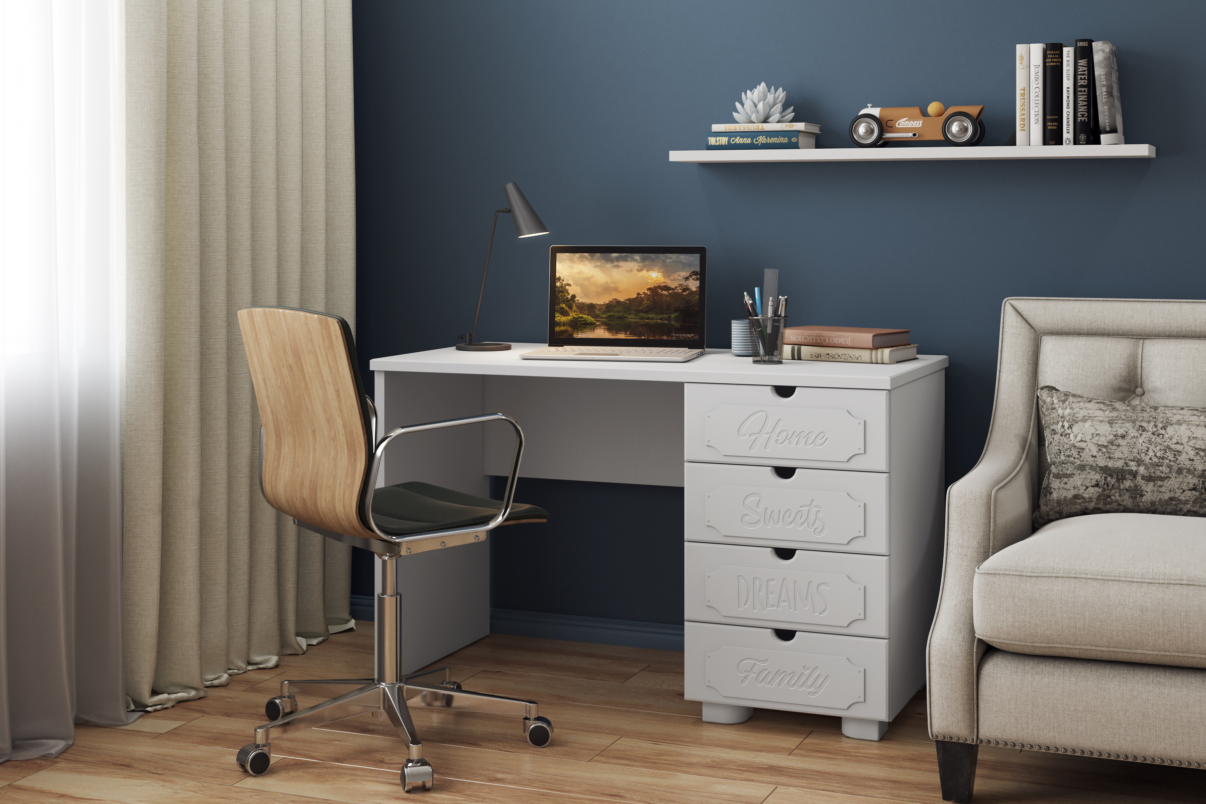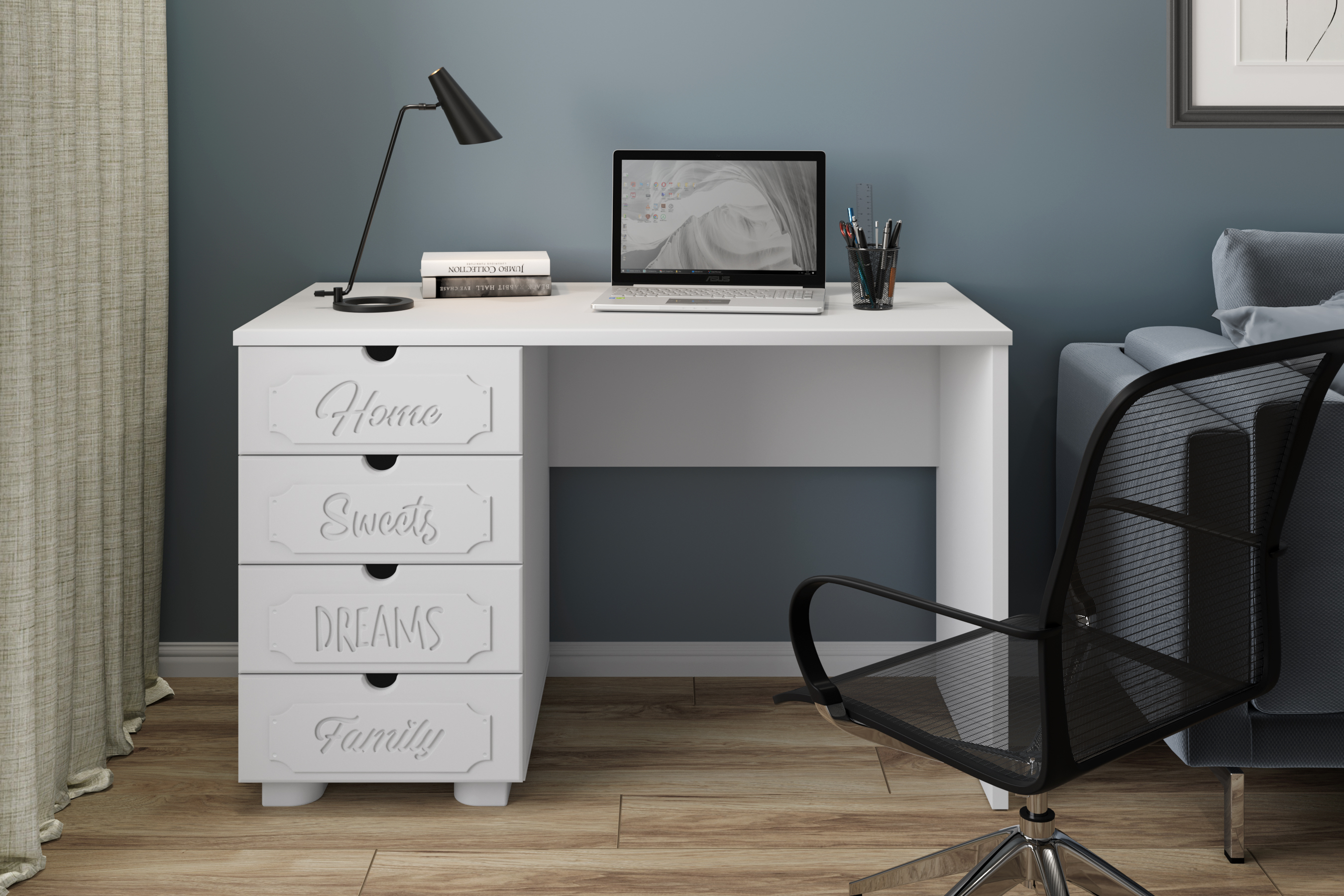 Стол письменный/компьютерный Дримстар ДС-4 станет прекрасным дополнением рабочего места студента, школьника. В ящиках используются телескопические направляющие полного выдвижения без доводчиков. Система мебели "Дримстар" включает в себя отдельные самостоятельные модули, сочетающие в себе функциональность и уникальность дизайна. С базовым набором модулей легко оформить интерьер любого помещения. Все модули можно комбинировать между собой. Фасады украшены надписями, которые придают моделям оригинальный вид. Коллекция "Дримстар" поможет вам в оформлении стильного и современного интерьера.