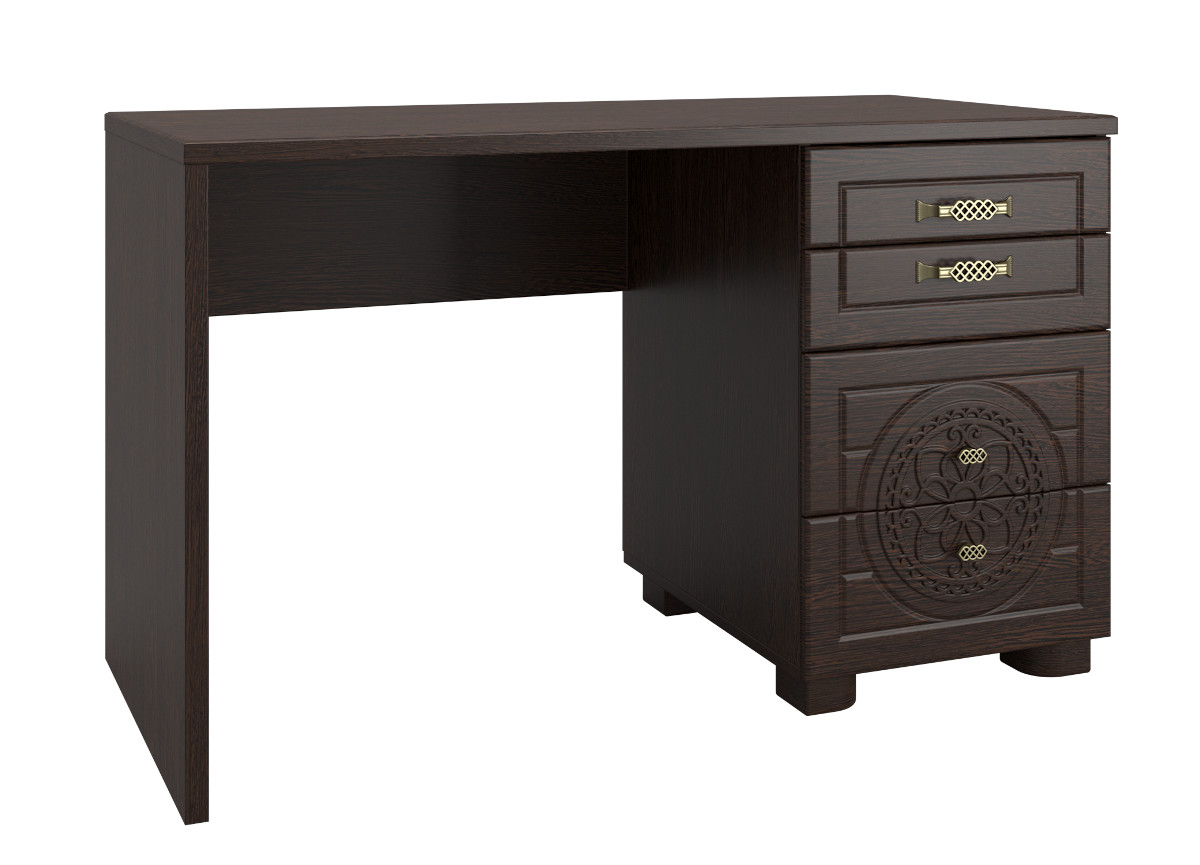 Письменный стол Монблан МБ-70К поможет создать достаточно комфортное рабочее место. Широкая и удобная столешница позволит разместить на столе стопку документов, канцелярские принадлежности, фотографии и вазу с красивыми цветами. Четыре выдвижных ящика созданы для хранения более ценных и важных предметов. Расположение ящиков только с правой стороны. Толщина столешницы: МДФ 25 мм, левая боковина выполнена из ЛДСП 25мм. Фурнитура: телескопическими направляющими полного выдвижения без доводчиков, ручки бронза, опоры пластик. Высота опоры 50 мм.