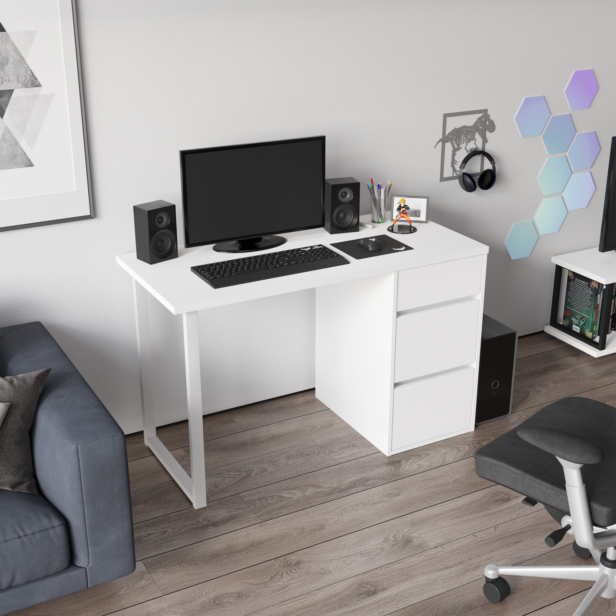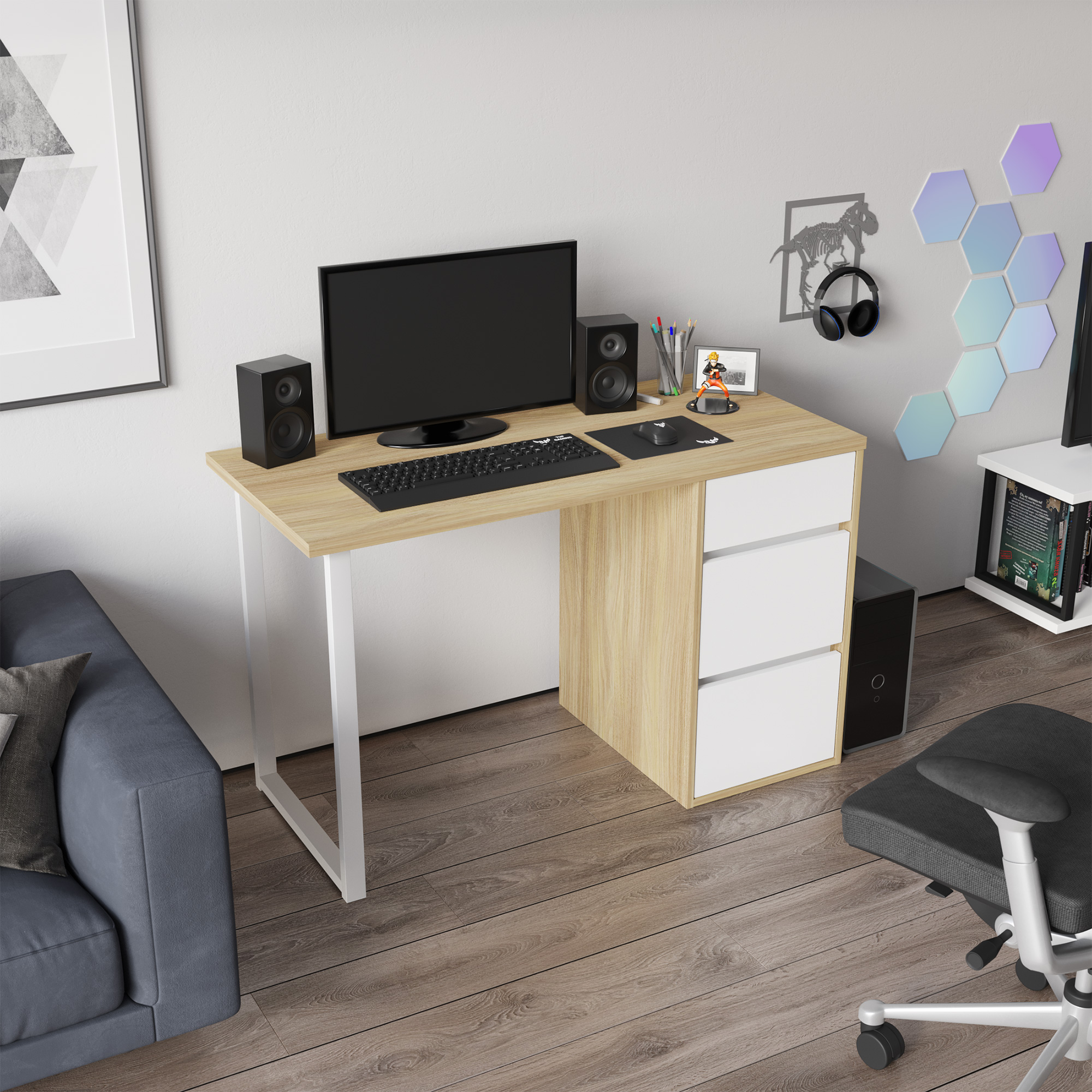 Стол компьютерный, письменный С-411 - это идеальное решение как для большого пространства, так и для небольшой комнаты. Стол прямой обеспечивает максимальную вместительность и удобство использования. Стол оснащен стильной металлической опорой. Три выдвижные ящика - вместительны и комфортны в расположении. Не нужно никуда вставать, за важными документами или вещами, достаточно расположить все рядом с собой! Стол может быть собран в зеркальном варианте «правым» или «левым». Столешница изготовлена из ЛДСП 25 мм, фасады МДФ 16 мм. Дно ящика ДВП 3 мм. Фурнитура: телескопические направляющие полного выдвижения без доводчиков, опора металл.