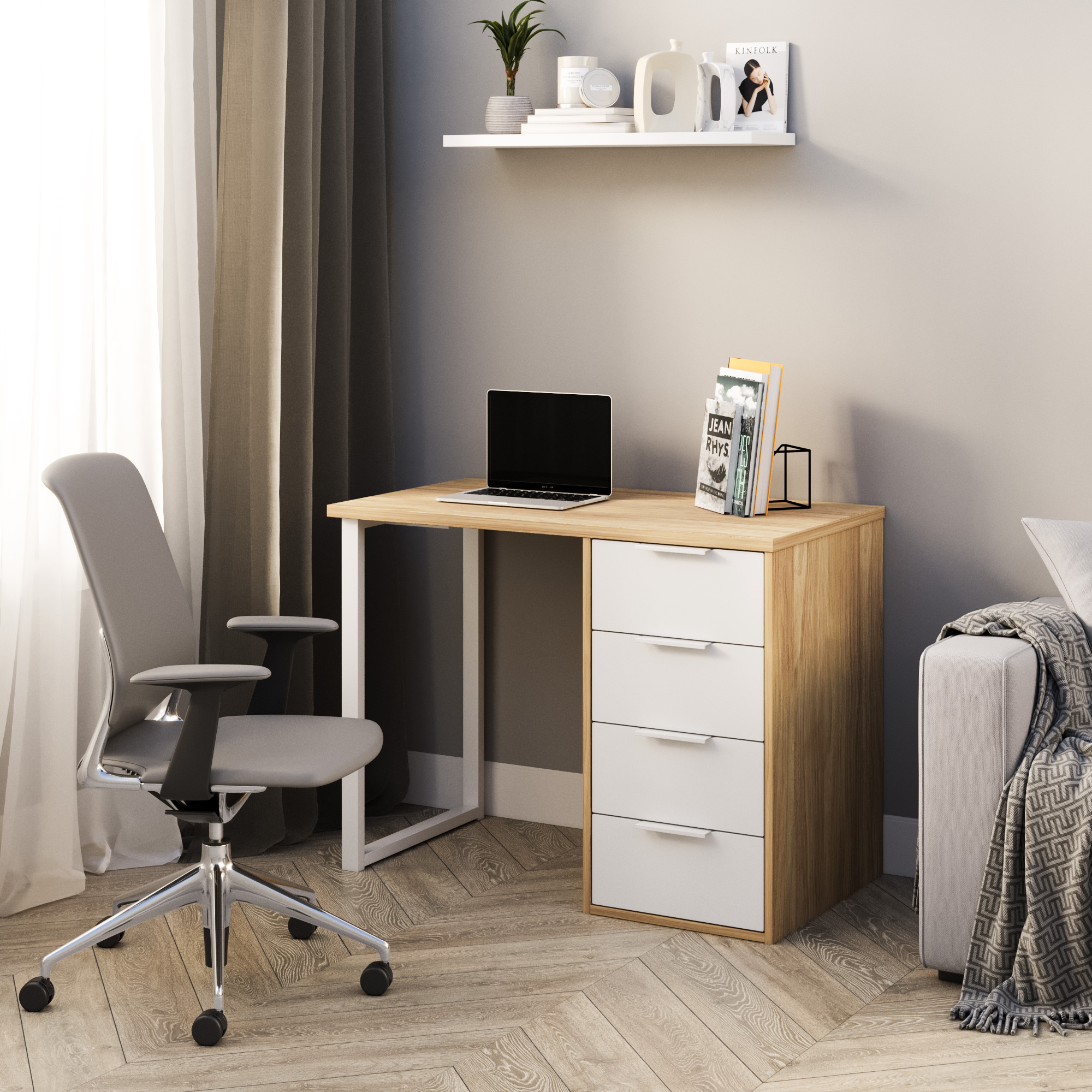 Стол компьютерный, письменный С-414 - это идеальное решение как для большого пространства, так и для небольшой комнаты. Стол прямой обеспечивает максимальную вместительность и удобство использования. Стол оснащен стильной металлической ножкой. Четыре выдвижные ящика - вместительны и комфортны в расположении. Не нужно никуда вставать, за важными документами или вещами, достаточно расположить все рядом с собой! Стол может быть собран в зеркальном варианте «правым» или «левым». Столешница изготовлена из ЛДСП 25 мм, фасады МДФ 16 мм. Дно ящика ДВП 3 мм. Фурнитура: ручки, опора металл, телескопические направляющие полного выдвижения без доводчиков.