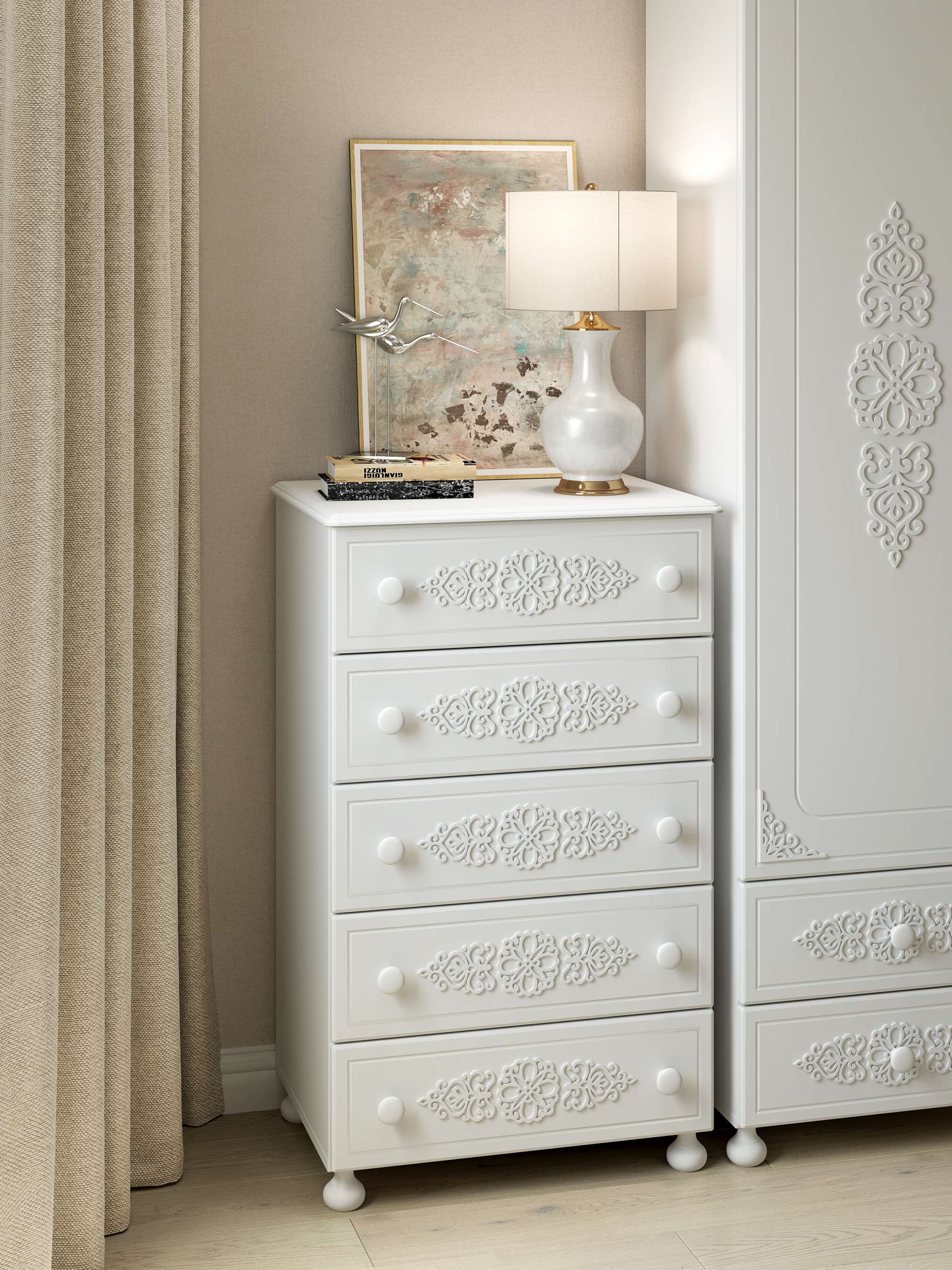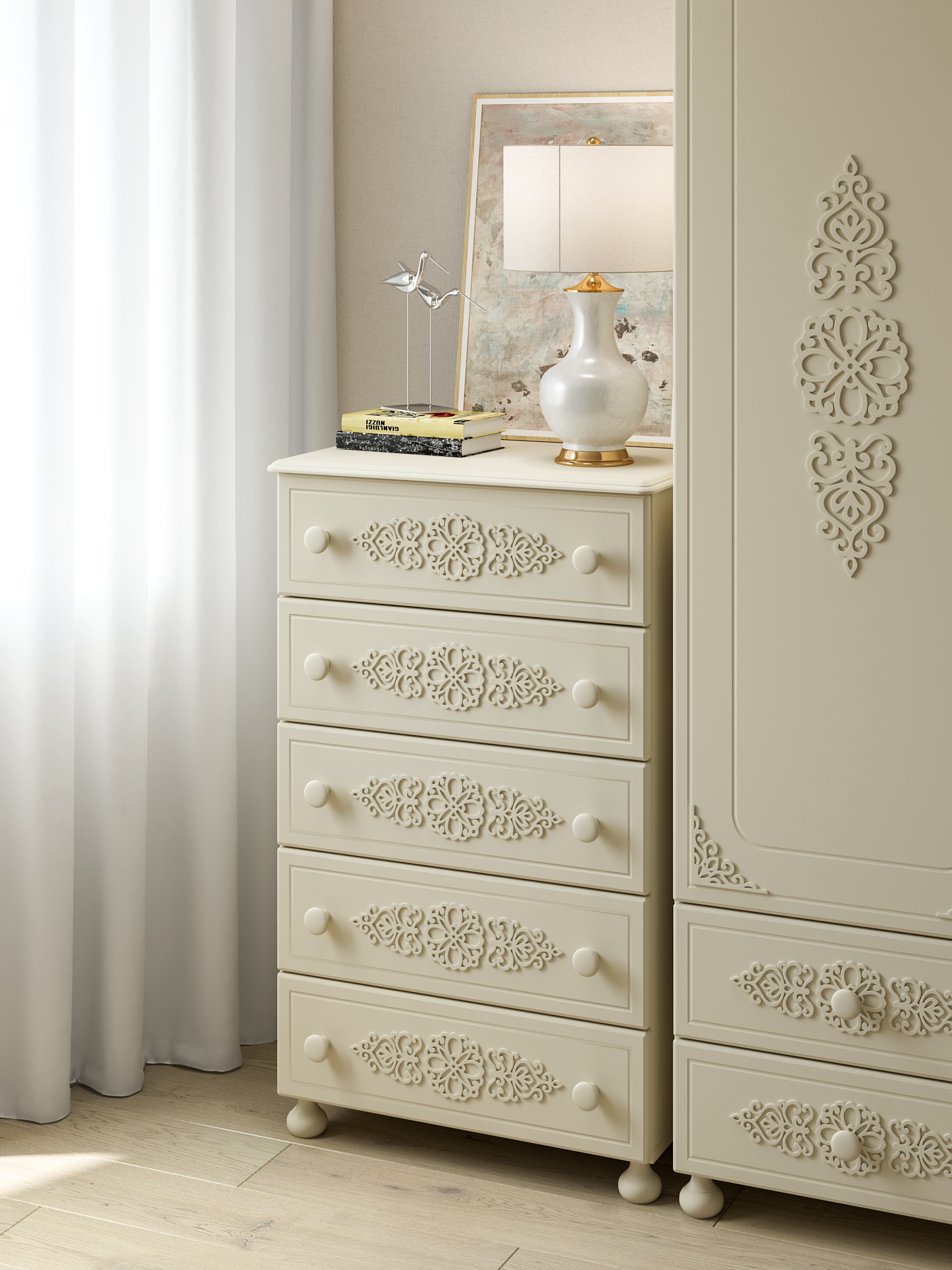 Роскошный комод из коллекции мебели Ассоль плюс АС-62, несомненно, станет украшением Вашей гостиной или спальни. Выдвижные ящики оснащены современными телескопическими направляющими полного выдвижения, обеспечивающие плавное и бесшумное выдвижение просторных ящиков. Мебель изготовлена из качественной ламинированной ДСП 16 мм. В оформлении фасадов МДФ применяется уникальная технология нанесения объемного узора 3D. Внутренние размеры ящика ш490 х г334 х в110 мм. Высота опоры 65 мм.