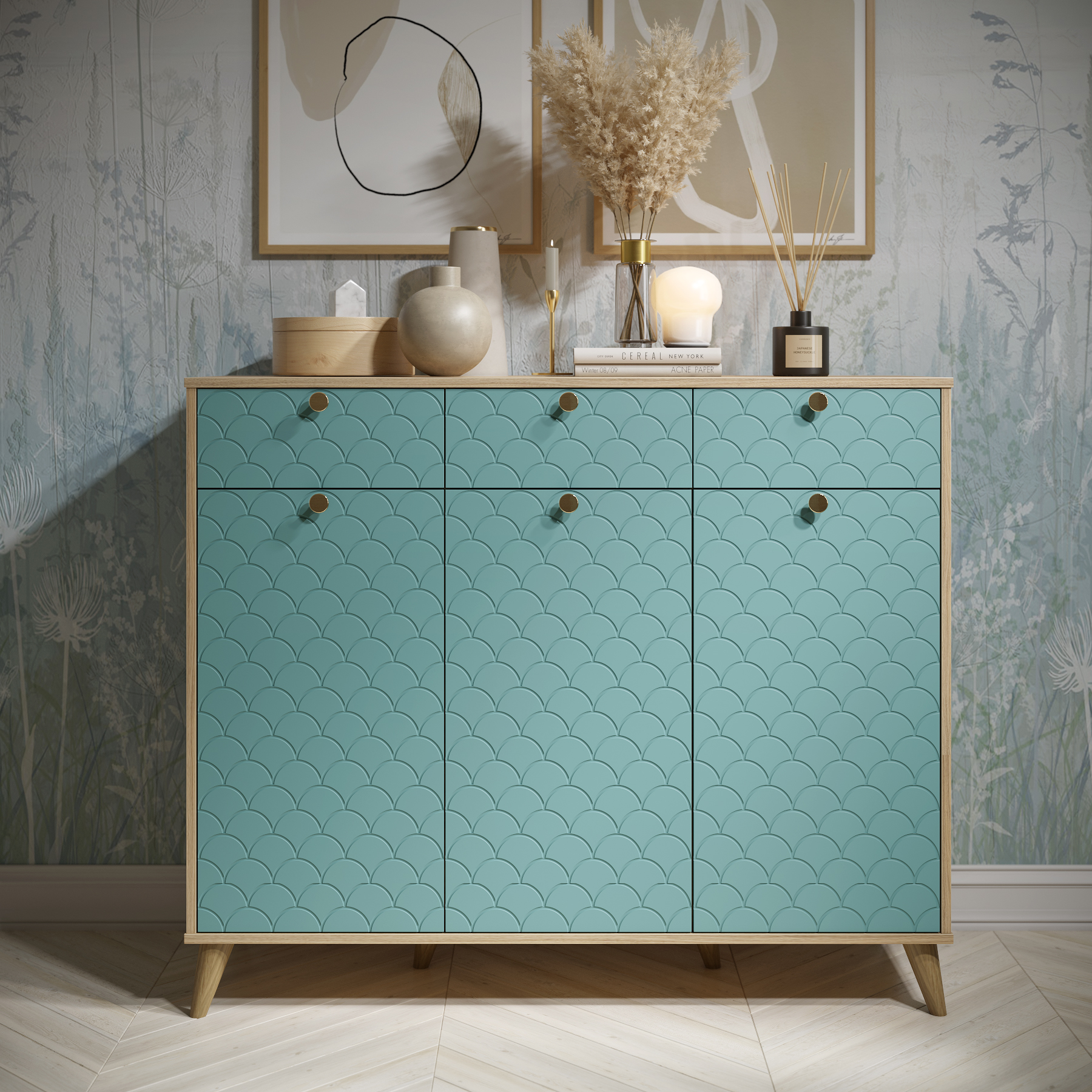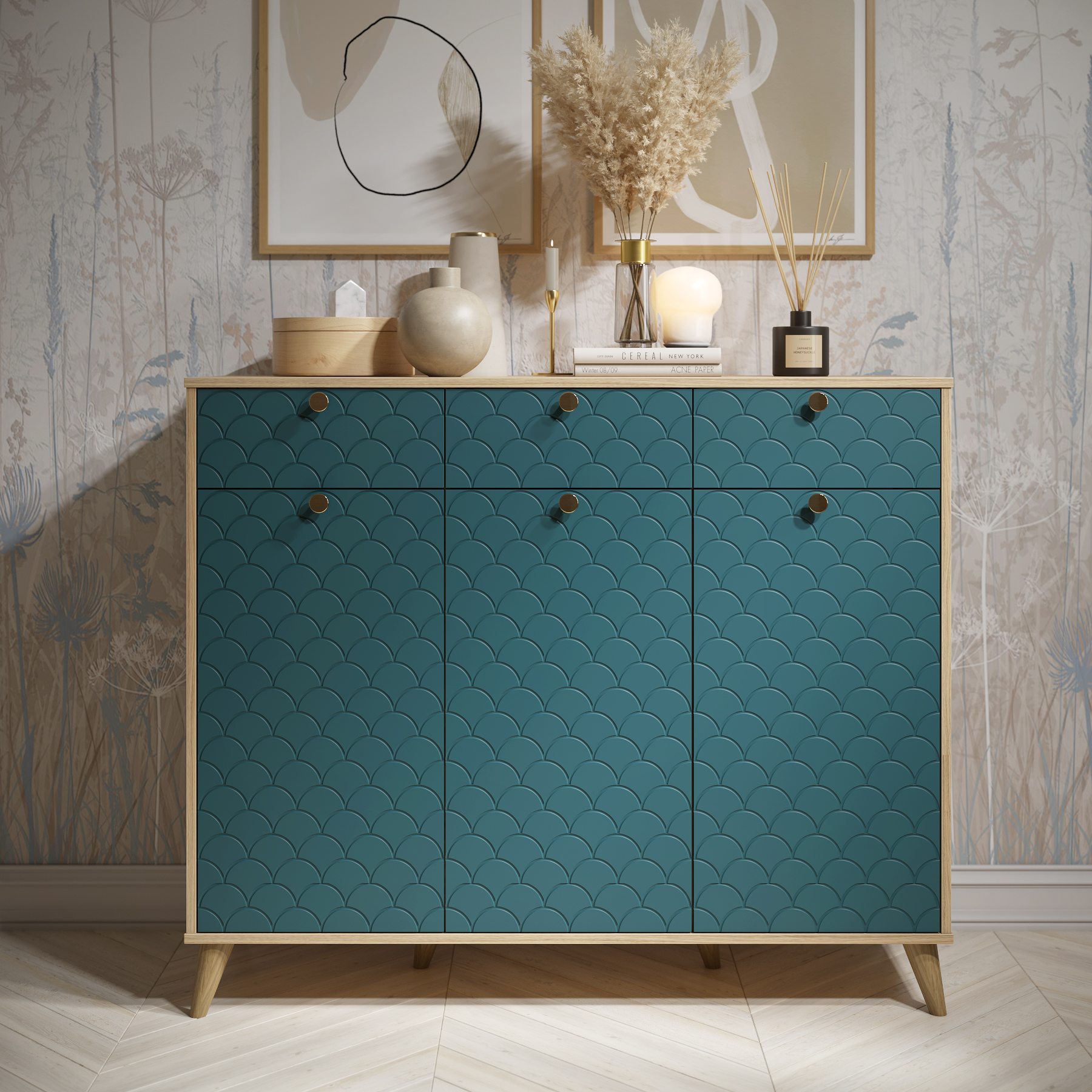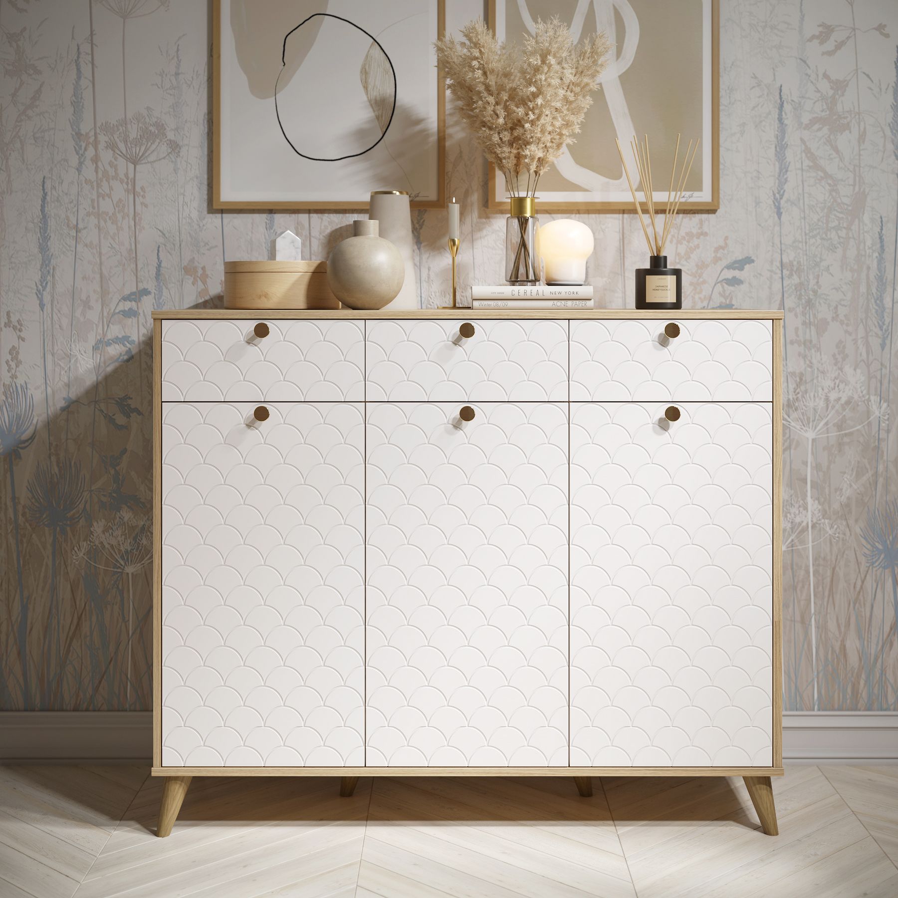 Тумба / комод Велламо ВО-05 станет функциональным и стильным дополнением гостиной комнаты или спальни. Комод визуально поделен на три секции с выдвижными ящиками и распашными дверцами. Стильные и необычные МДФ фасады с фрезеровкой и металлическими ручками. Дно ящика двп 3 мм. Высота опоры из массива дерева 120 мм. Фурнитура: телескопические направляющие полного выдвижения без доводчиков, ручки металл, опоры деревянные.