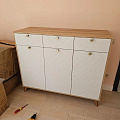 Тумба / комод Велламо ВО-05 станет функциональным и стильным дополнением гостиной комнаты или спальни. Комод визуально поделен на три секции с выдвижными ящиками и распашными дверцами. Стильные и необычные МДФ фасады с фрезеровкой и металлическими ручками. Дно ящика двп 3 мм. Высота опоры из массива дерева 120 мм. Фурнитура: телескопические направляющие полного выдвижения без доводчиков, ручки металл, опоры деревянные.