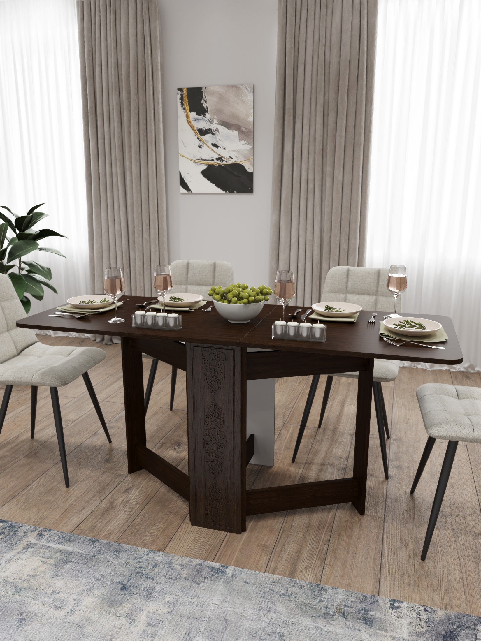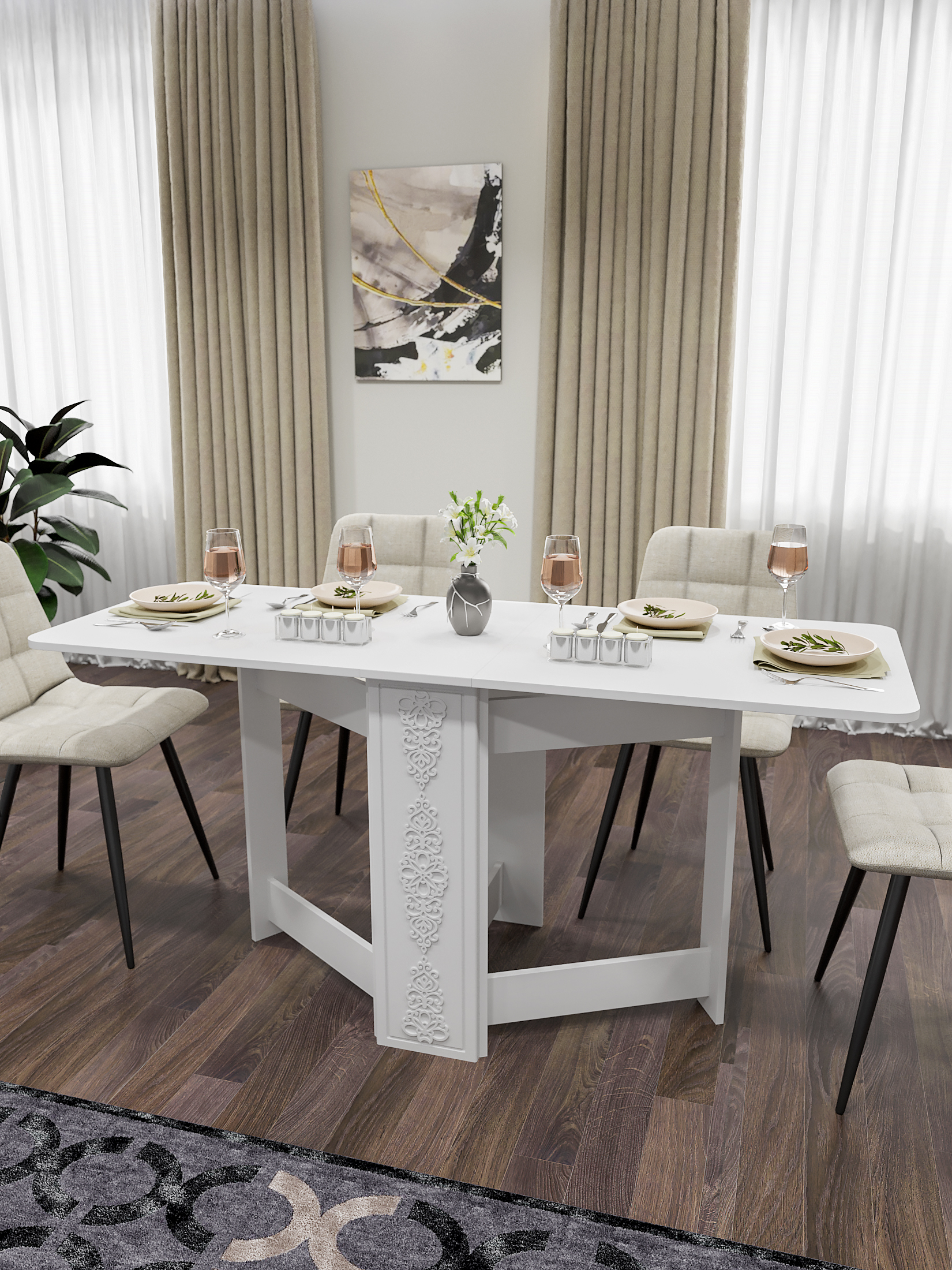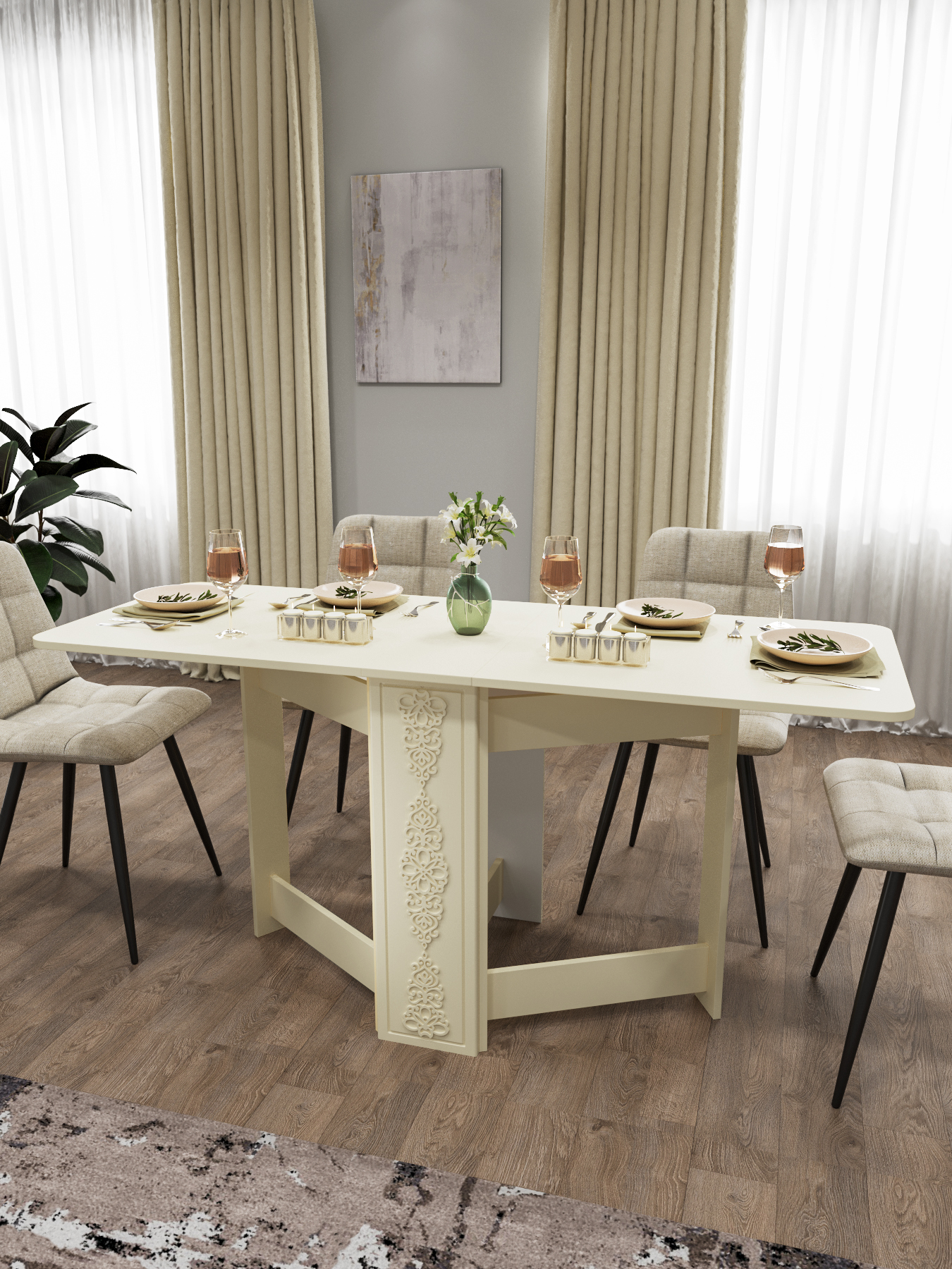 Стол раскладной СМ-4 на шесть персон. Удобный механизм раскладывания. Компактный размер в собранном виде. Мебель изготовлена из качественной ЛДСП 16 мм. В оформлении фасадов МДФ применяется уникальная технология нанесения объемного узора 3D. Важная информация. Мебель доставляется в разобранном виде, в упаковках.