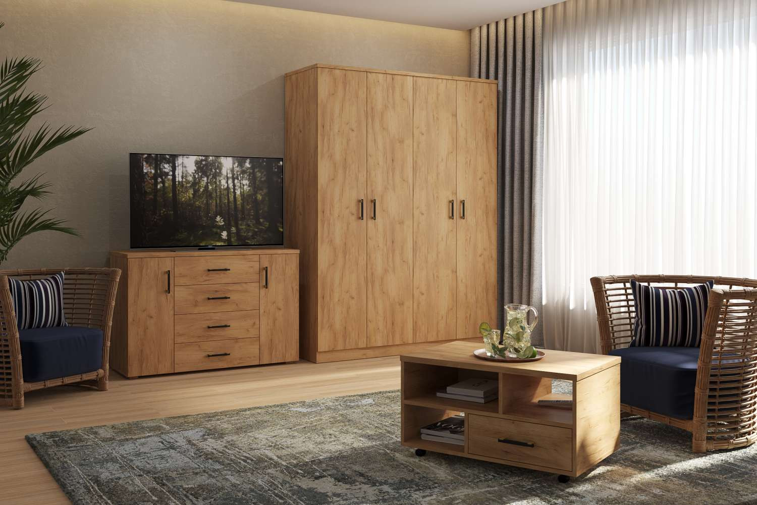 Линейка мебели "Виктория" - выгодное решение для отелей и гостиниц, сбалансированное по цене, качеству и функциональности. В производстве используется ЛДСП, толщины 25/16 мм. Фасады обработаны ударопрочной кромкой ПВХ толщиной 2/0,6 мм. В коллекции используется современная, качественная фурнитура. Базовая комплектация представлена в декоре Дуб крафт золотой и Северное дерево светлое.