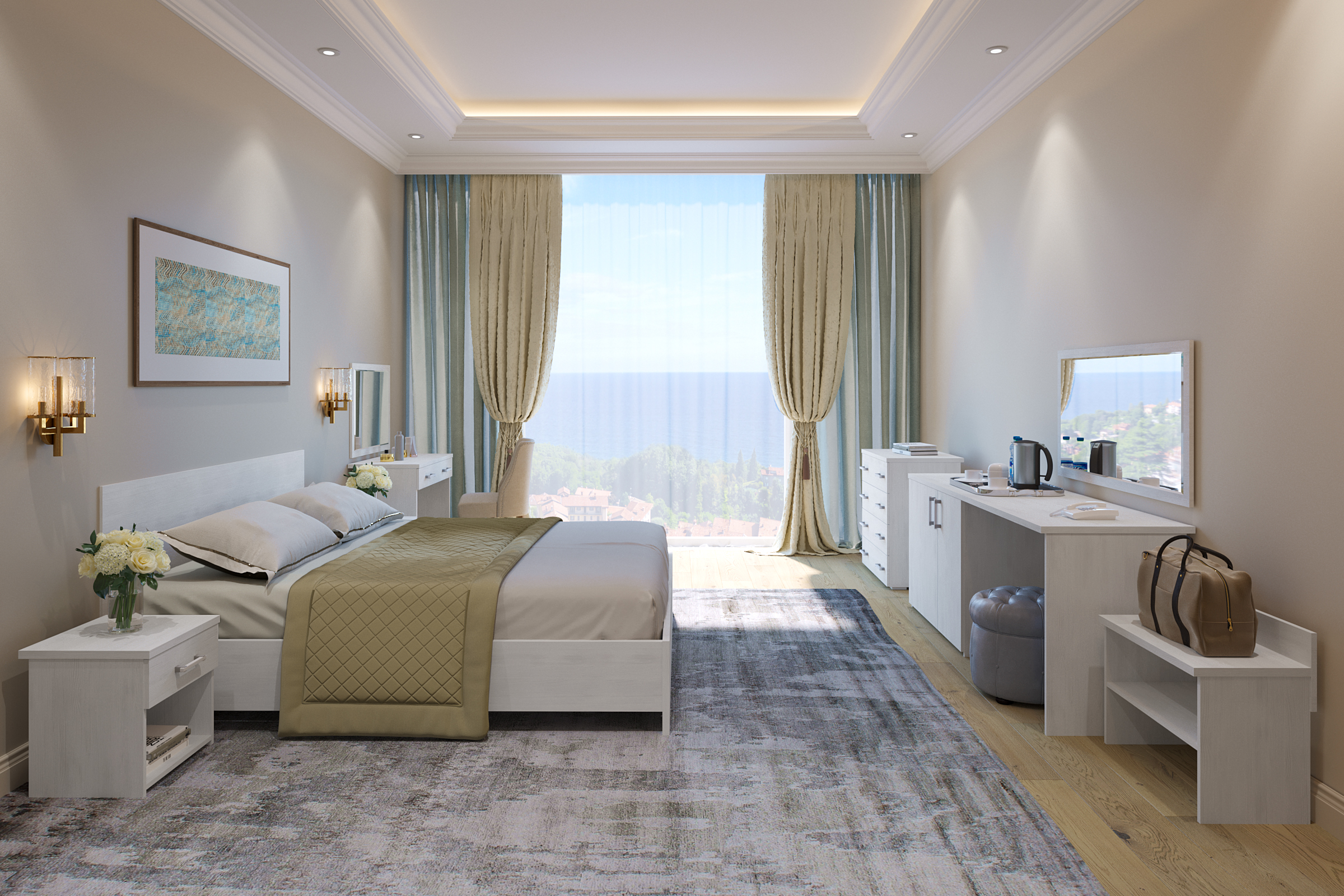 Линейка мебели "Виктория" - выгодное решение для отелей и гостиниц, сбалансированное по цене, качеству и функциональности. В производстве используется ЛДСП, толщины 25/16 мм. Фасады обработаны ударопрочной кромкой ПВХ толщиной 2/0,6 мм. В коллекции используется современная, качественная фурнитура. Базовая комплектация представлена в декоре Дуб крафт золотой и Северное дерево светлое.