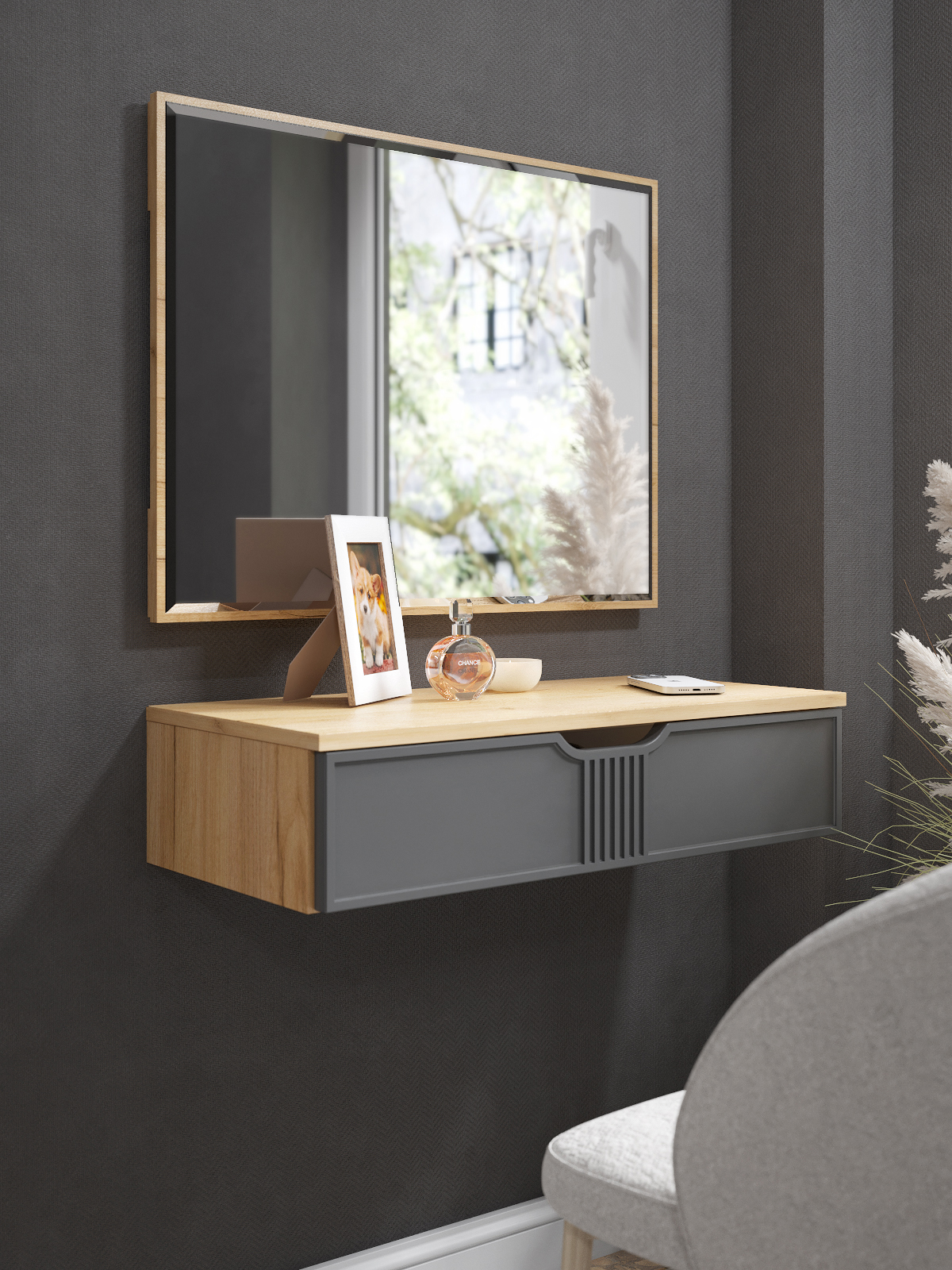 Тумба подвесная/консольный столик с зеркалом ЭЛ-22+ЭЛ-24 с выдвижным ящиком идеально впишется в любой интерьер. Изящный дизайн, функциональность и компактность, а так же его крепление на стену позволяют создать интересное дизайнерское решение и интерьер не будет выглядеть громоздко. Отсутствие лишних деталей делает консоль легкой и практичной не загромождает пространство визуально. Несмотря на компактный размер столешница позволяет разместить ноутбук, зеркало, косметичку, настольную лампу или все для учебы и творчества. Установить можно практически в любом помещении: в детской комнате, в гостиной, в прихожей, на балкон или лоджию как полка для зеркала, для ключей, для создания индивидуального интерьерного решения. Фурнитура: телескопические направляющие полного выдвижения без доводчиков.