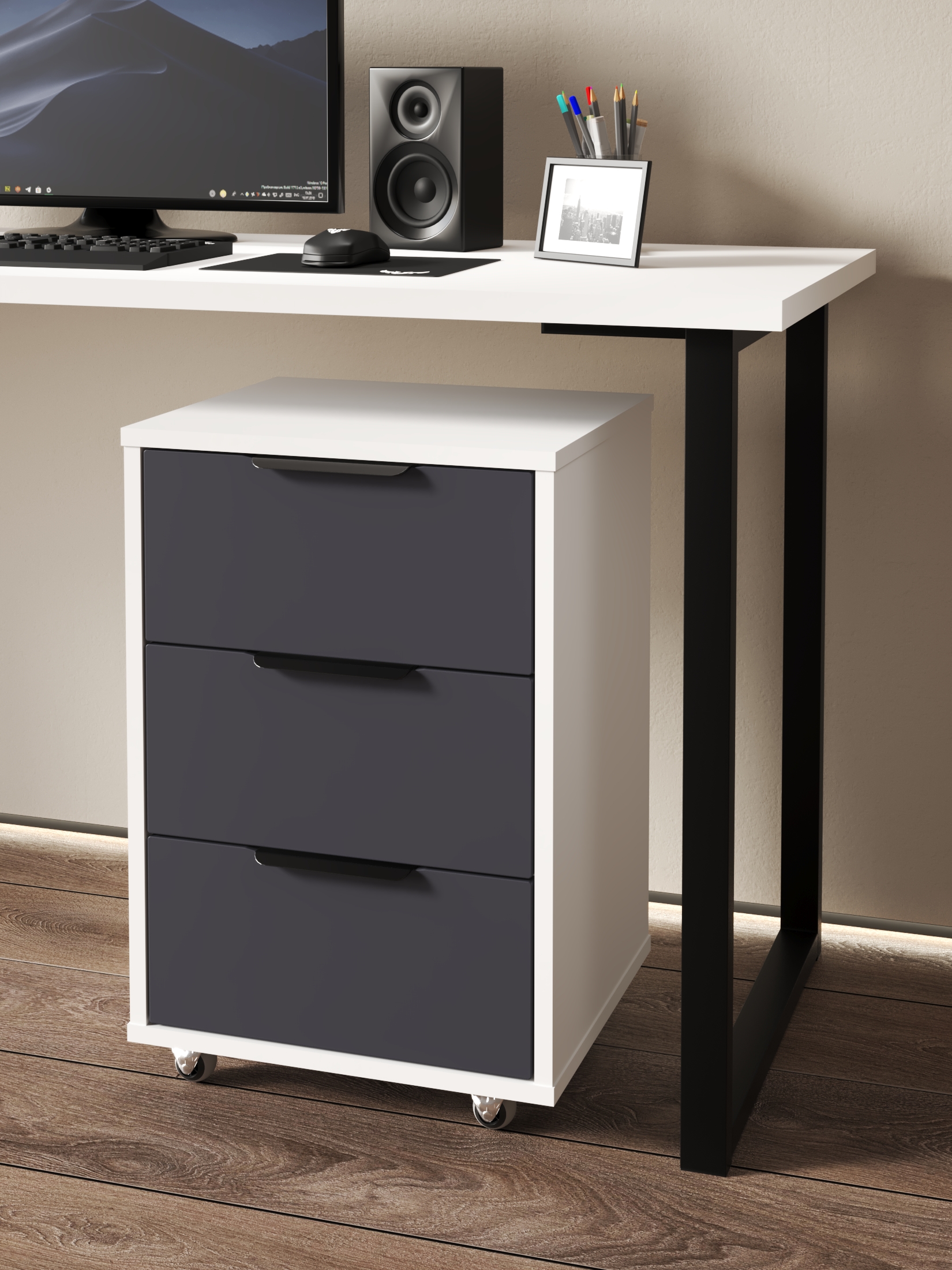 Тумба мобильная К-54 подойдет для бизнеса, для рабочего места. Тумба оснащена 3-мя выдвижными ящиками для различных мелочей.