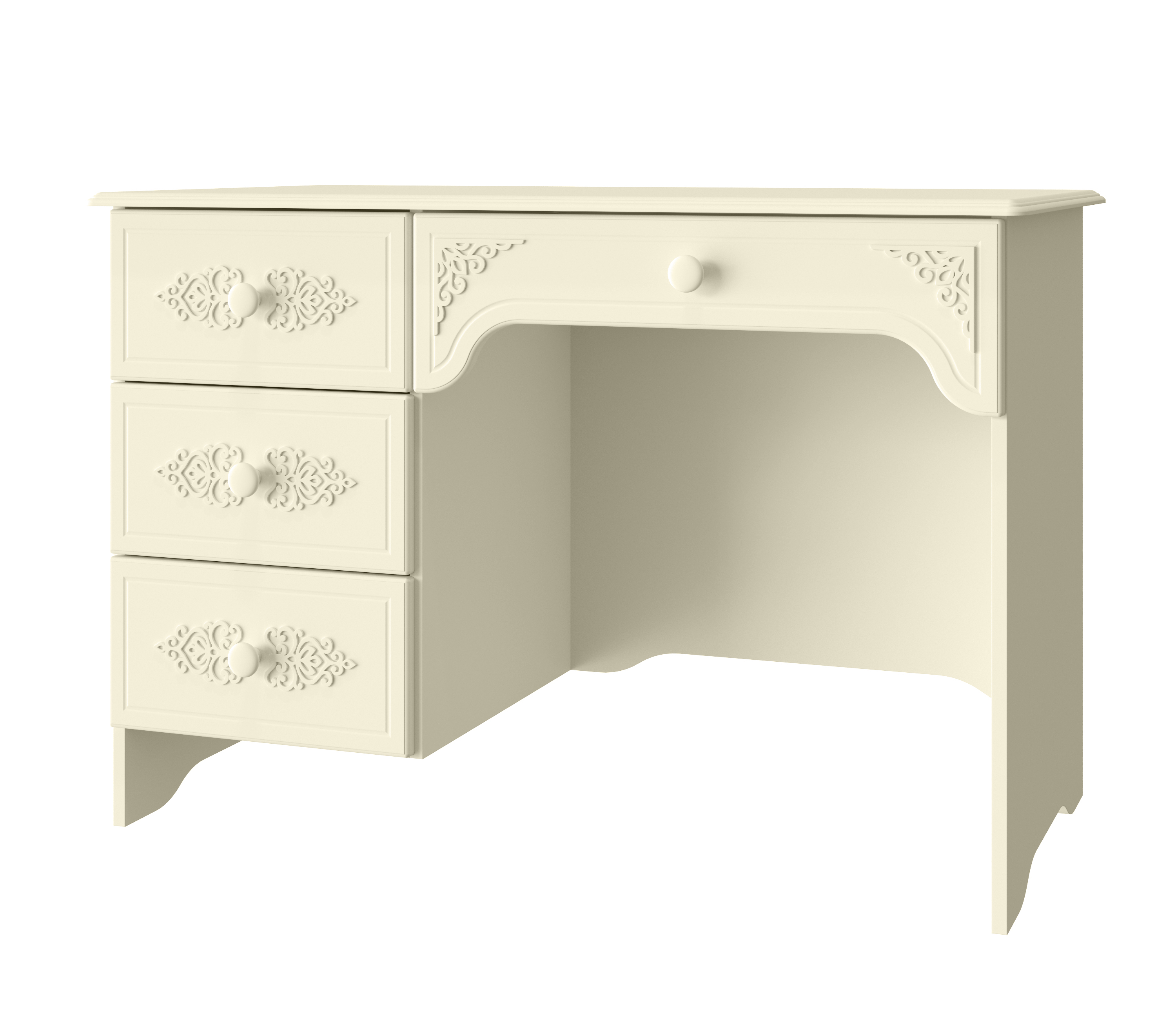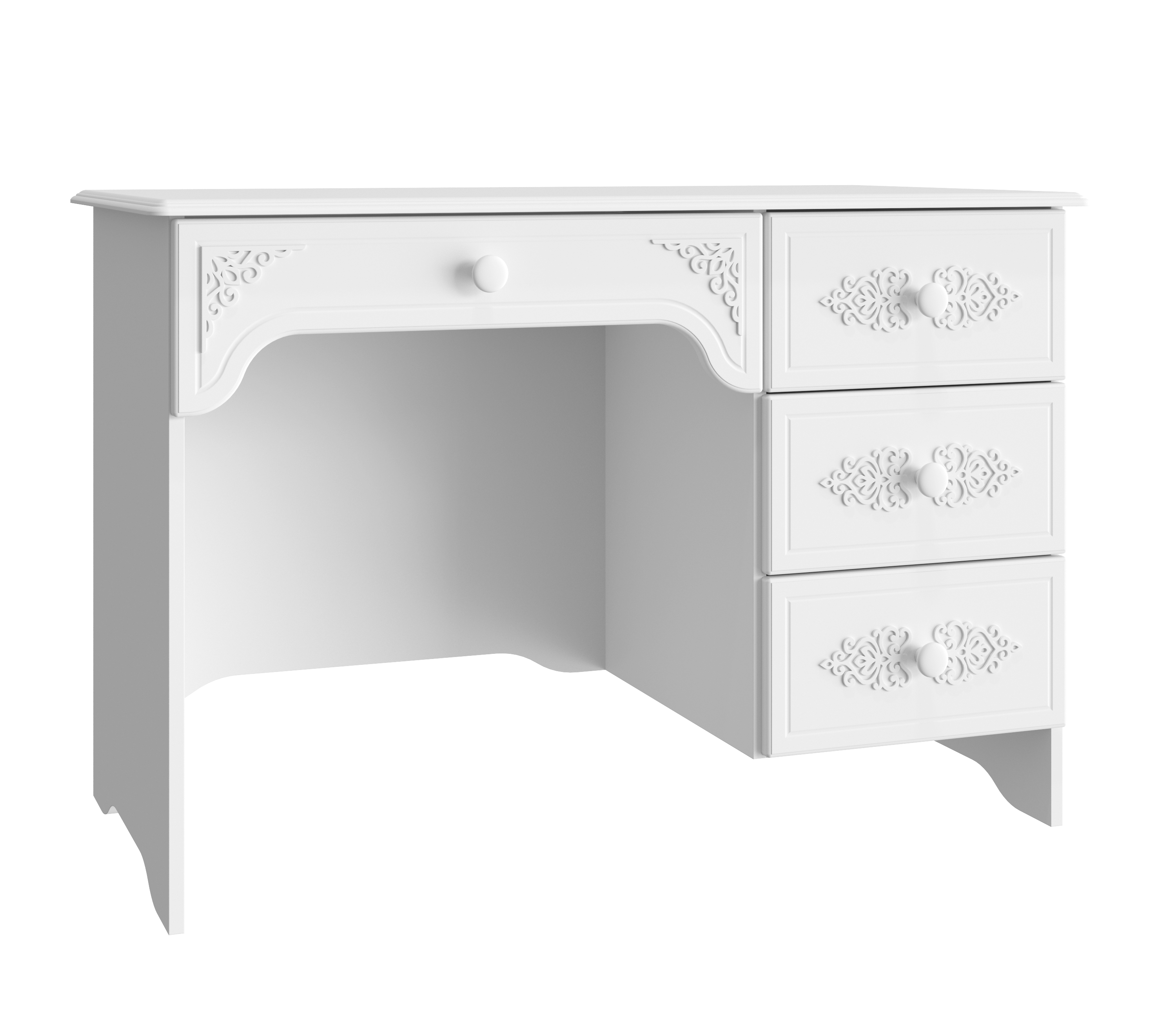 Стол Ассоль АС-6 из изысканной коллекции модульной мебели "Ассоль" может служить как письменным, так и макияжным, если его дополнить АС-38 из одноименной коллекции. Стол снабжен одним большим и тремя стандартными выдвижными ящиками, которые смогут разместить большое количество предметов и аксессуаров. 3D накладки, которые украшают фасады ящиков, уравновешиваются лаконичным дизайном ручек. Столешница изготовлена из МДФ 16мм. Размер центрального ящика: 576х384х110мм, размер боковых ящиков: 310х384х110. Расстояние от центрального ящика до пола 610 мм. Ширина тумбы с ящиками 388 мм. Фурнитура: ручки пластик, телескопические направляющие полного выдвижения без доводчиков.