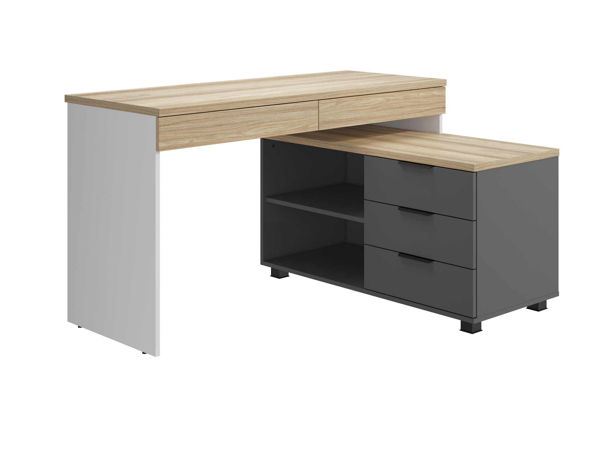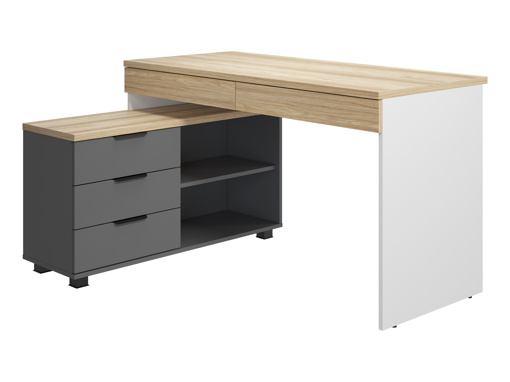 Стол угловой Скайлайт СЛ-21К станет отличной основой для создания комфортного рабочего пространства школьника или студента. Ширина столешницы 1350 мм позволит с комфортом заниматься учебой или творчеством. Габариты стола позволят разместить на нем ноутбук или компьютер с широкоформатным монитором и другие периферийные устройства. Два выдвижных ящика позволят удобно хранить канцелярские принадлежности, они расположены под столешницей и имеют телескопические направляющие полного выдвижения без доводчиков. Частью стола является тумба с тремя выдвижными ящиками и двумя открытыми нишами для хранения, расположение тумбы только с левой стороны. Письменный стол может быть собран как в угловом, так и в прямом исполнении - для обоих вариантов в тумбе предусмотрены технологические отверстия. Корпус стола изготовлен из ЛДСП 16 мм, столешница стола и крышка тумбы ЛДСП 25 мм. Размеры модуля в прямом исполнении: 1919х755х520 мм. Фурнитура: ручки металл. Высота опоры 50 мм. Опоры регулируемые.