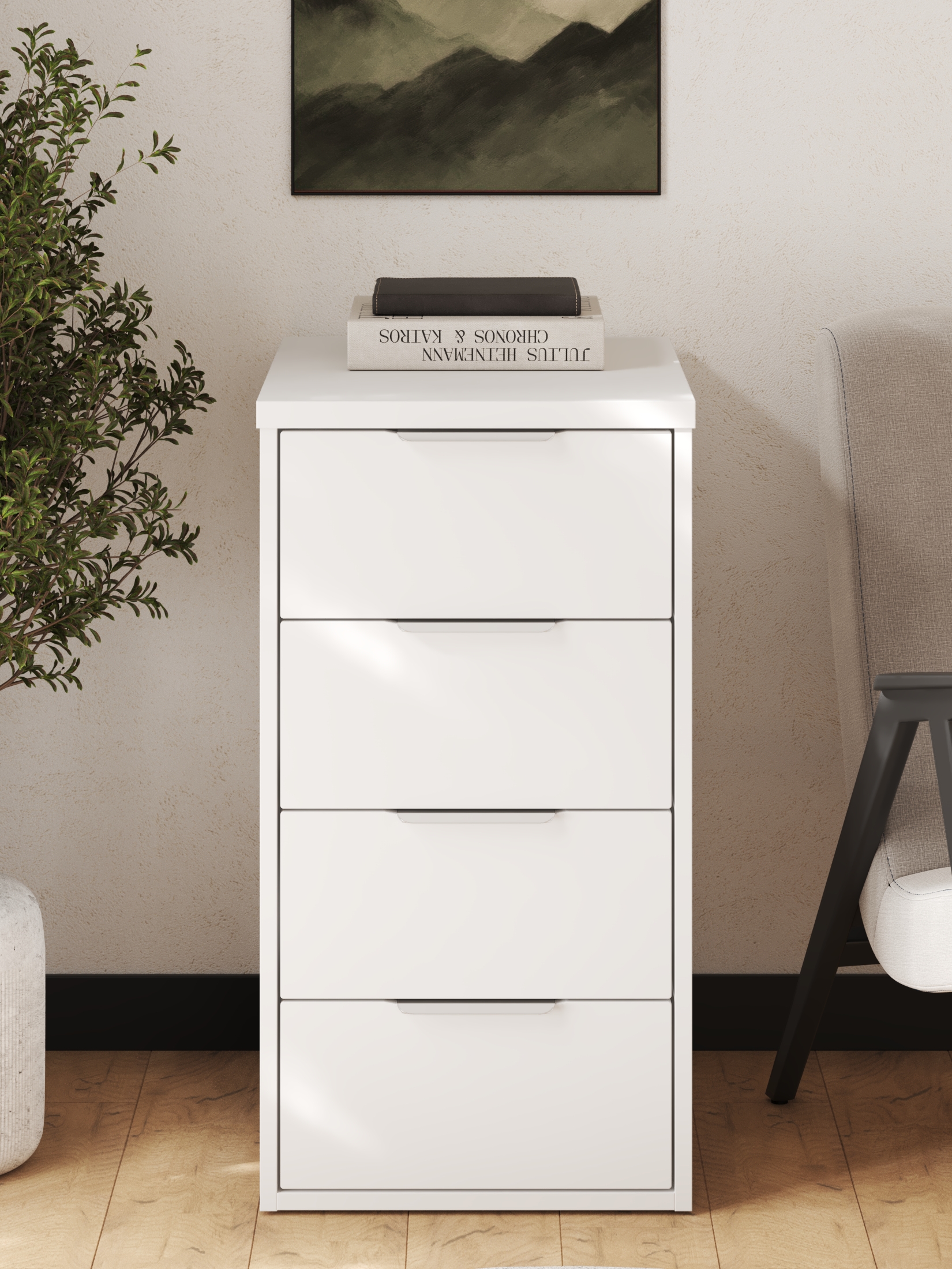Размеры модуля (ш/в/г) в мм: 406х760х550 Цвет корпуса/фасада: белый структурный/меренга Материал корпуса/фасада: ЛДСП 25/16мм, МДФ 16мм  Тумба К-52 подойдет для офиса, бизнеса, для рабочего места. Можно использовать как подставную тумбу к столу С-400 или отдельно для принтера. Тумба оснащена 4-мя выдвижными ящиками для различных мелочей. Фурнитура: телескопические направляющие полного выдвижения без доводчиков Столешница ЛДСП 25мм, обработана противоударной кромкой 2 мм Металлические ручки Фасады ящиков МДФ 16мм Задняя стенка ЛДСП 16мм