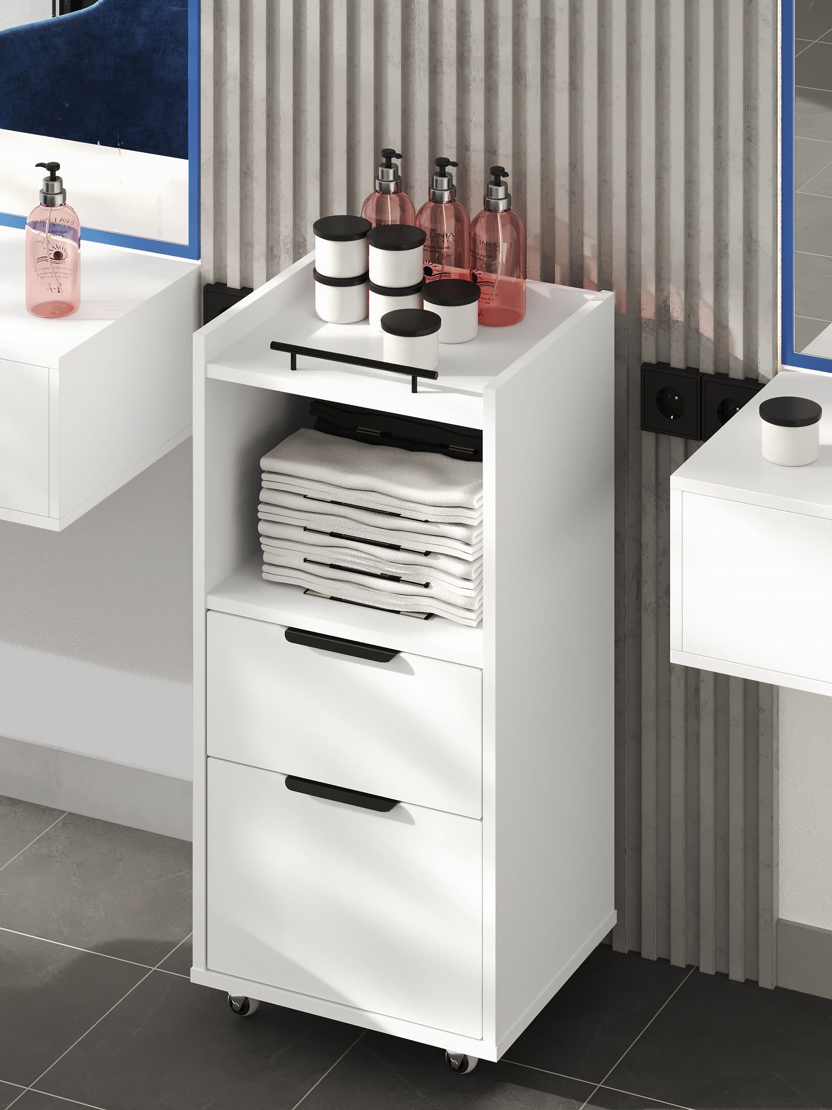 Размеры модуля (ш/в/г) в мм: 404х840х350 Цвет корпуса/фасада: белый структурный/меренга Материал корпуса/фасада: ЛДСП 16мм, МДФ 16мм  Тумба комбинированная К-33 подойдет для бизнеса, салонов красоты. Можно использовать как тележку-этажерку, тумбочку косметологическую, парикмахерскую,  для массажиста, мастера по маникюру, педикюру, шугарингу, наращивания ресниц.  Тумба обработана противоударной кромкой 2 мм Металлические ручки Фасады ящиков МДФ Прорезиненные колесики с металлической крепежной платформой, с возможностью поворота на 360 град