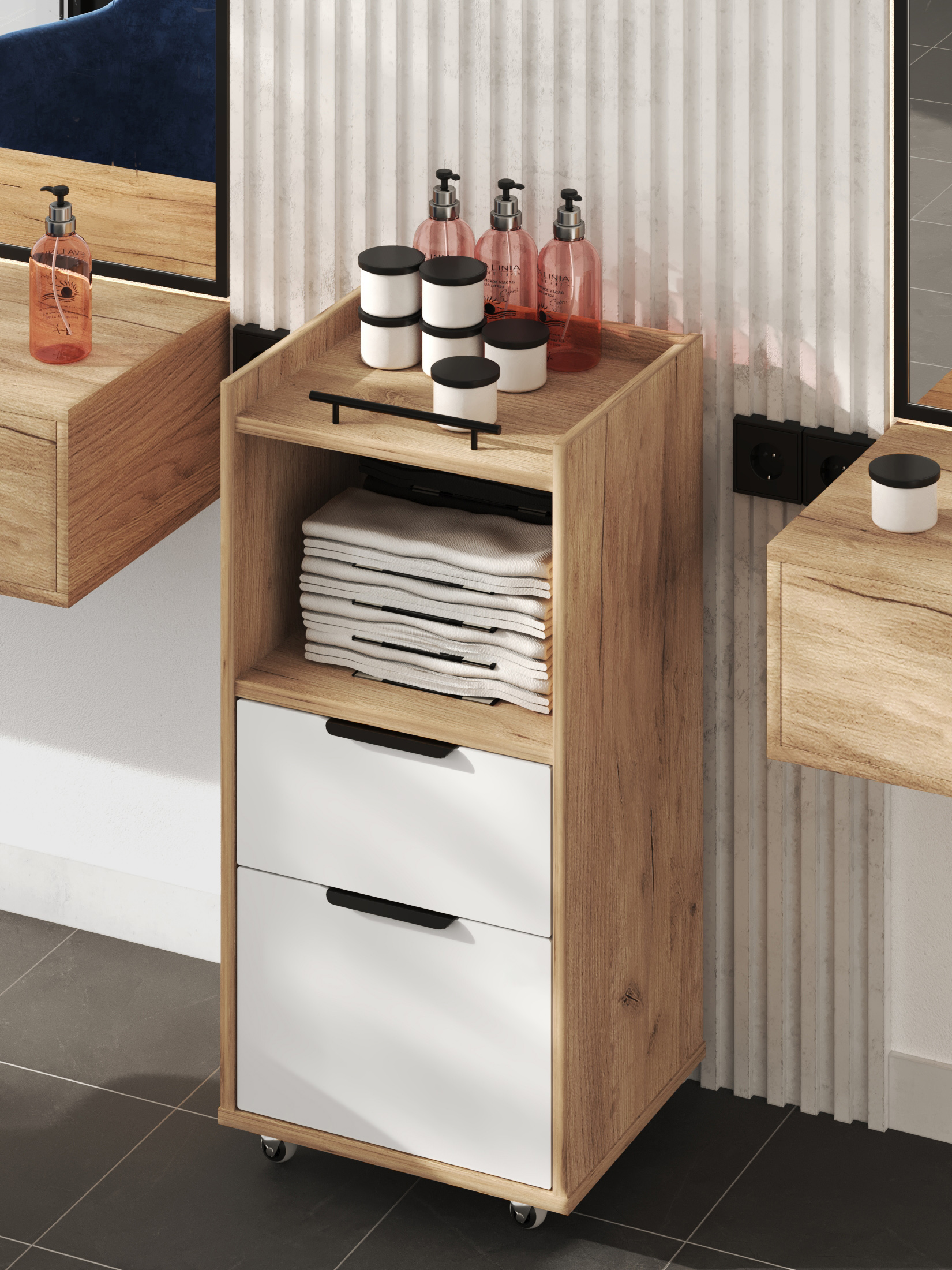 Размеры модуля (ш/в/г) в мм: 404х840х350 Цвет корпуса/фасада: дуб крафт золотой/меренга Материал корпуса/фасада: ЛДСП 16мм, МДФ 16мм  Тумба комбинированная К-33 подойдет для бизнеса, салонов красоты. Можно использовать как тележку-этажерку, тумбочку косметологическую, парикмахерскую,  для массажиста, мастера по маникюру, педикюру, шугарингу, наращивания ресниц.  Тумба обработана противоударной кромкой 2 мм Металлические ручки Фасады ящиков МДФ Прорезиненные колесики с металлической крепежной платформой, с возможностью поворота на 360