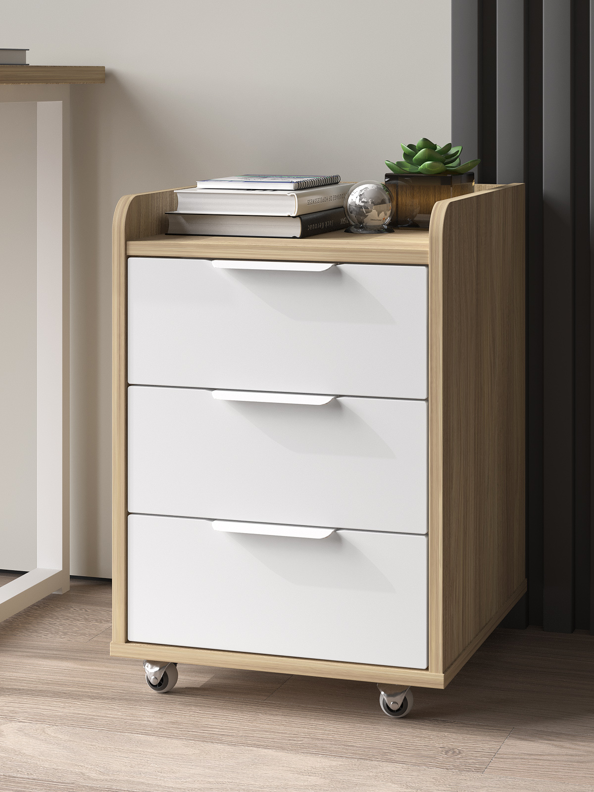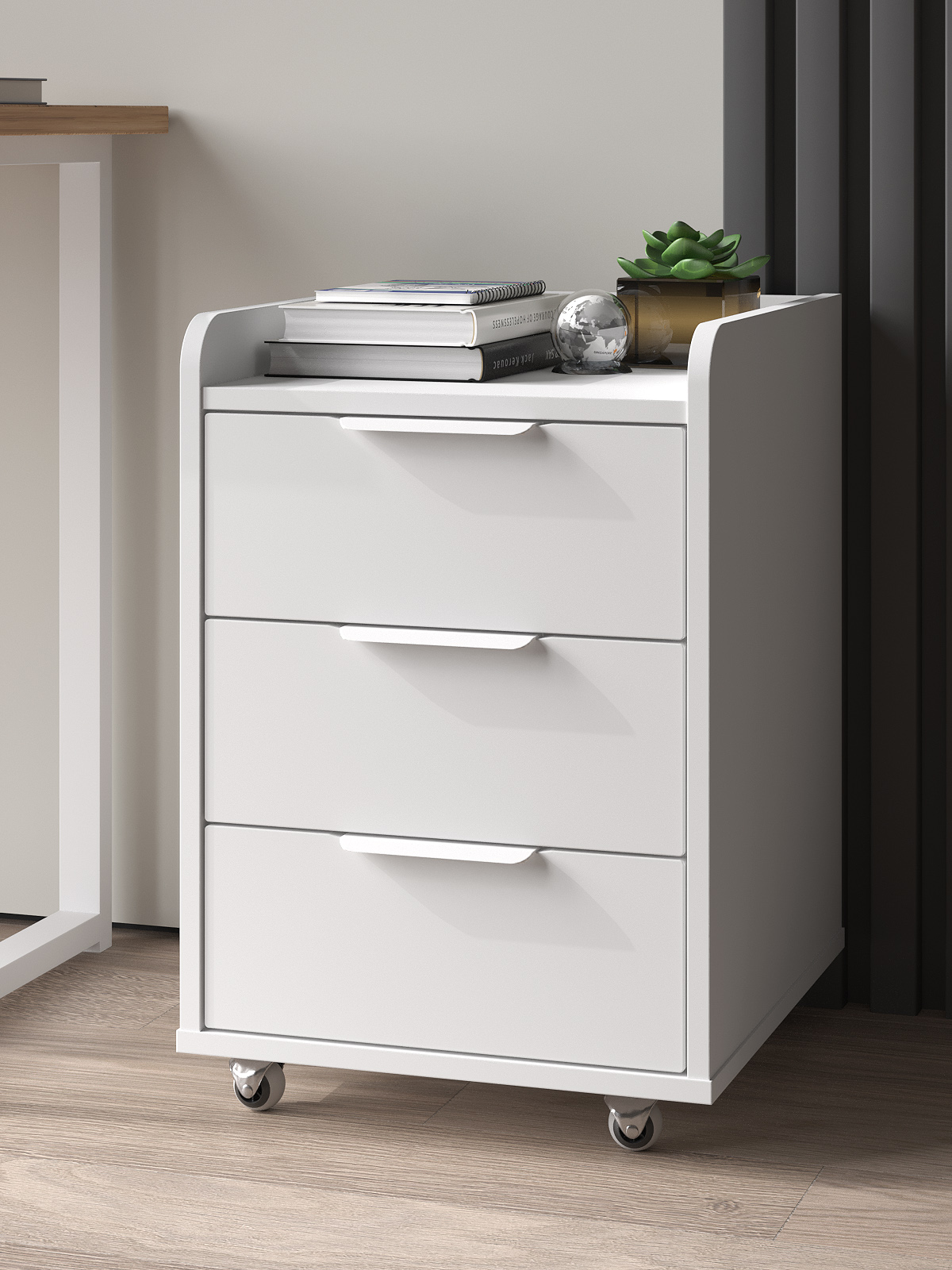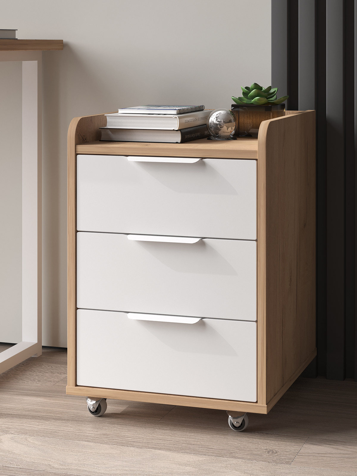 Тумба мобильная К-57 подойдет для бизнеса, для рабочего места. Тумба оснащена 3-мя выдвижными ящиками для различных мелочей.