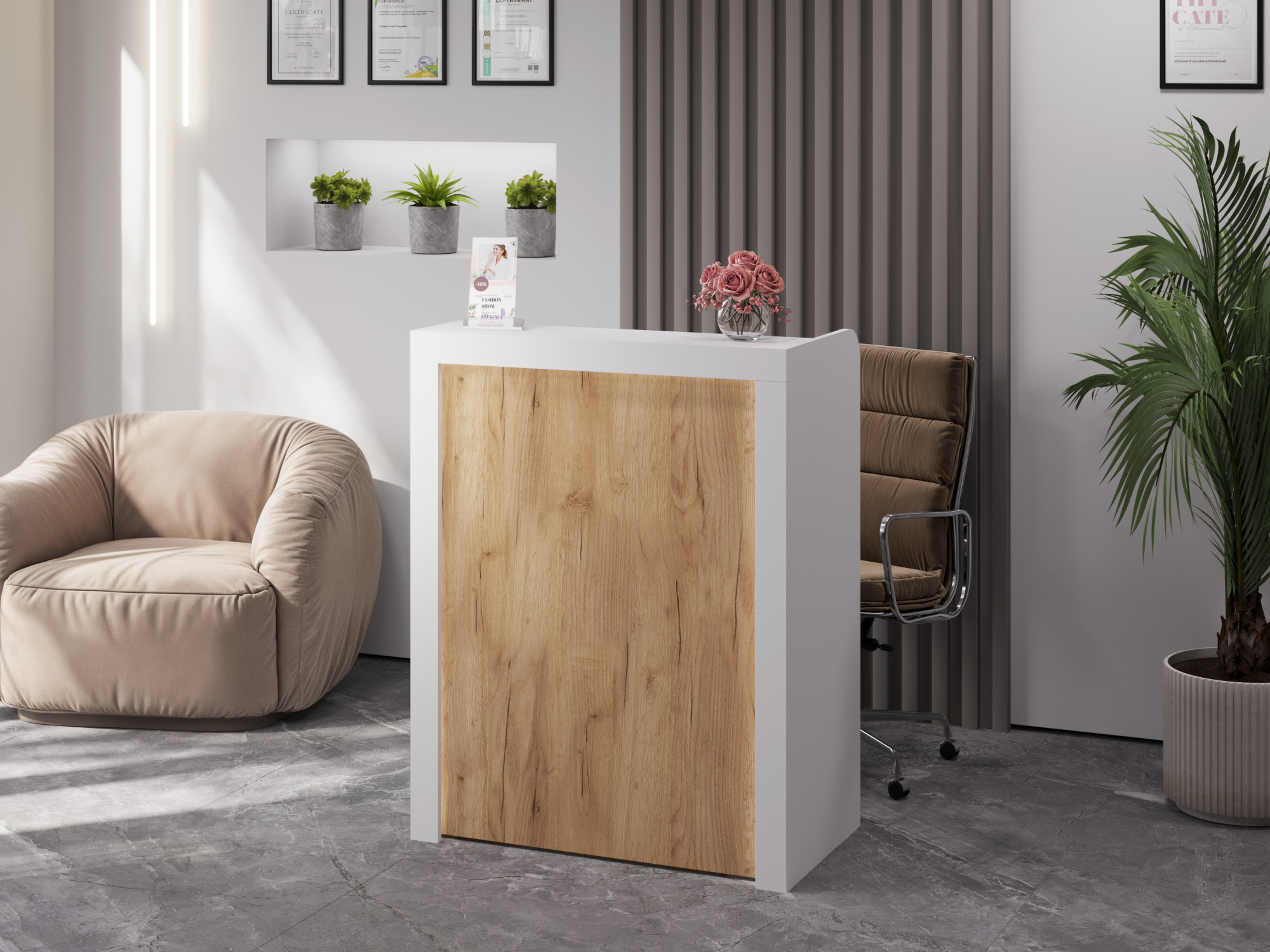 Компактный ресепшен, цена, качество и дизайн - 100&#37;. Пришло все целое. Скругленные углы у боковых стенок - то, что нужно: безопасно и стильно. Видна текстура дерева, смотрится натурально, при необходимости можно перекрасить в нужный цвет. Предусмотрена ниша под подсветку, в ней же можно разместить любой декор, например, стабилизированный мох. Рекомендую к покупке!
