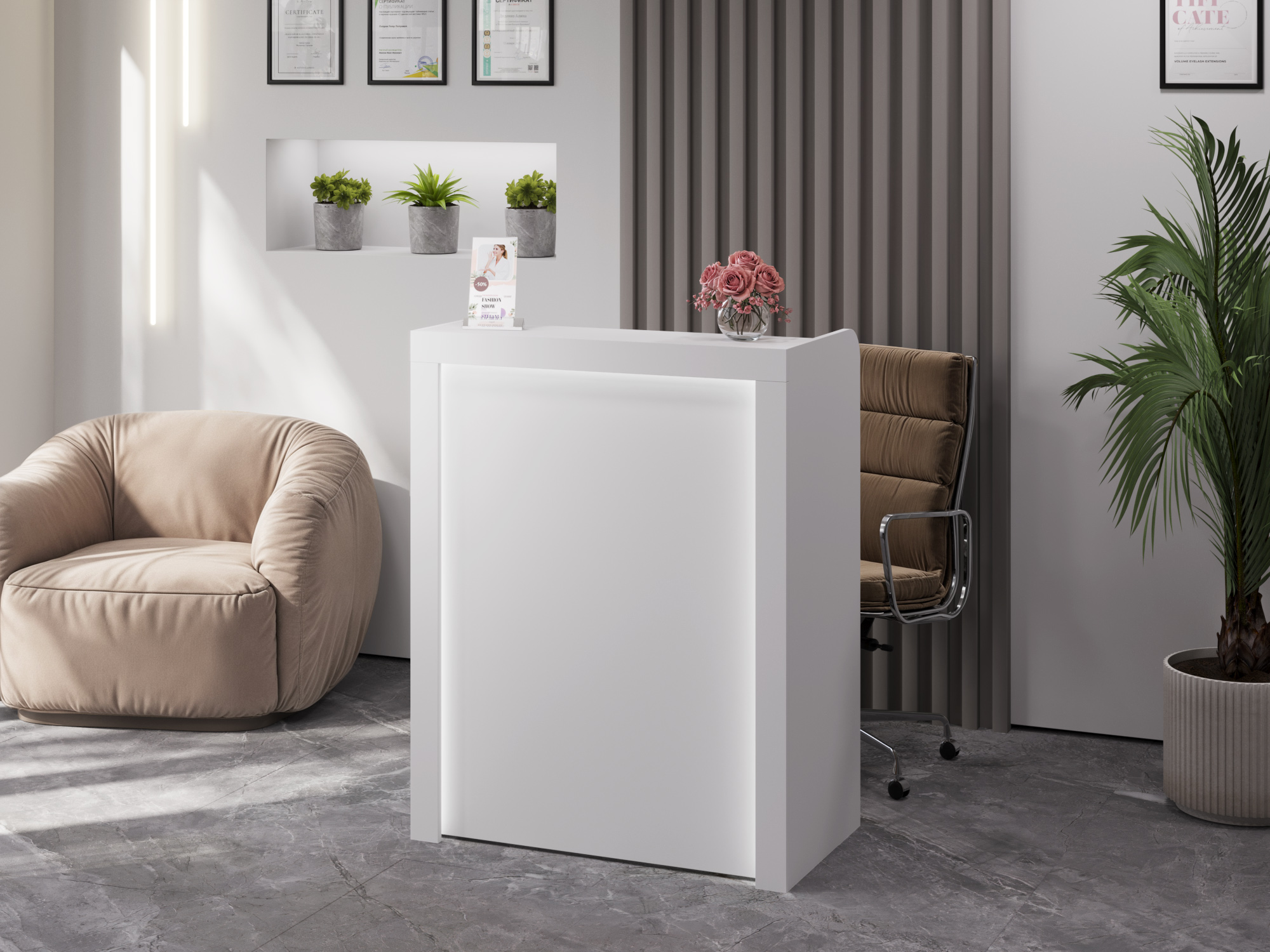 Размеры модуля (ш/в/г) в мм: 900х1150х500Цвет корпуса/фасада: белый структурныйМатериал корпуса/фасада: ЛДСП 16 ммТумба/ресепшн/стойка администратора/кассовый стол Р-01 стильная, отлично подойдет для салона красоты или кабинета.Есть ниша для светодиодной ленты (*лента в комплект не входит. Вам понадобиться 310 см ленты)Торцы обработаны противоударной кромкой 2ммРегулируемые опоры по высотеВажная информация. Мебель доставляется в разобранном виде, в упаковках.