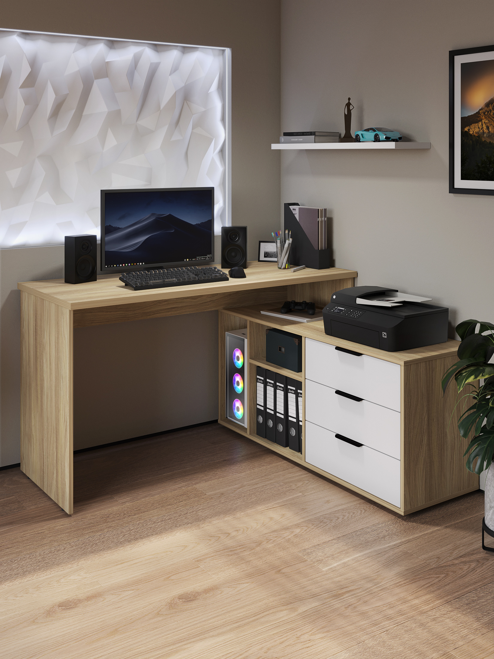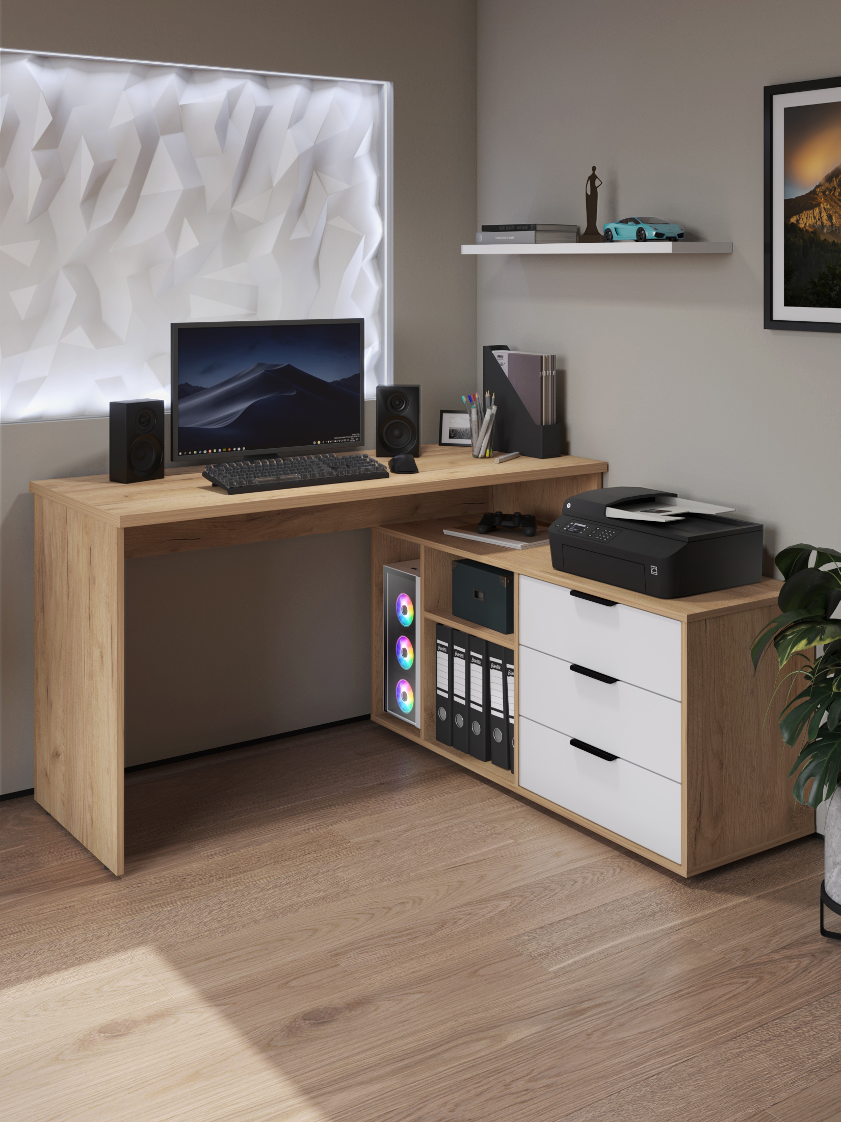 Размеры модуля (ш/в/г) в мм: 1350х760х1228 Цвет корпуса/фасада: дуб крафт золотой/меренга Материал корпуса/фасада: ЛДСП 16/25мм, МДФ 16мм Стол угловой Оптима ОП-22 станет отличной основой для создания комфортного рабочего пространства школьника, студента или офисного работника. Стол может быть собран только с тумбой справа. Характеристики стола ОП-22: Три выдвижных ящика позволят удобно хранить канцелярские принадлежности Отдельная ниша для системного блока Телескопические направляющие полного выдвижения без доводчиков Корпус стола изготовлен из ЛДСП 16