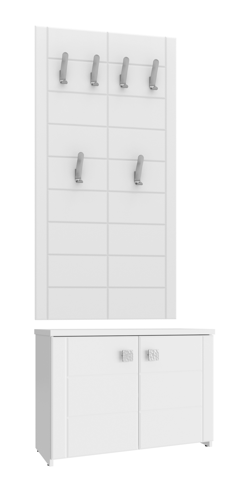 Комплект прекрасно впишется в интерьер современной прихожей. Вешалка может быть установлена на любой высоте. Фурнитура: металлизированные квадратные ручки, петли с доводчиками, крючки пластик, опоры регулируемые. Важная информация. Мебель доставляется в разобранном виде, в упаковках.