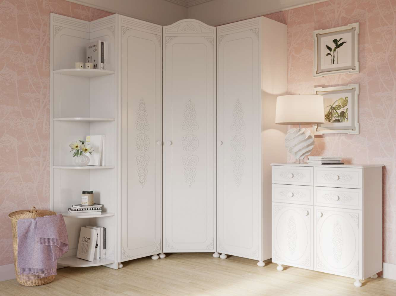 Цвет корпуса/фасада: белый структурный/белое дерево Материал корпуса/фасада: ЛДСП 16мм, МДФ 16мм Комплект данного гарнитура: Комод Ассоль АС-18 белое дерево / 1 шт Шкаф Ассоль АС-531К (левый) белое дерево / 1 шт Шкаф Ассоль АС-531К (правый) белое дерево / 1 шт Шкаф угловой Ассоль АС-521К (правый c короной) белое дерево / 1 шт Стеллаж угловой Ассоль АС-54 белое дерево / 1 шт Доставка и сборка: мебель поставляется в разобранном виде, в надежной упаковке, с подробной инструкцией по сборке. Сборка осуществляется самостоятельно или с привлечением спе