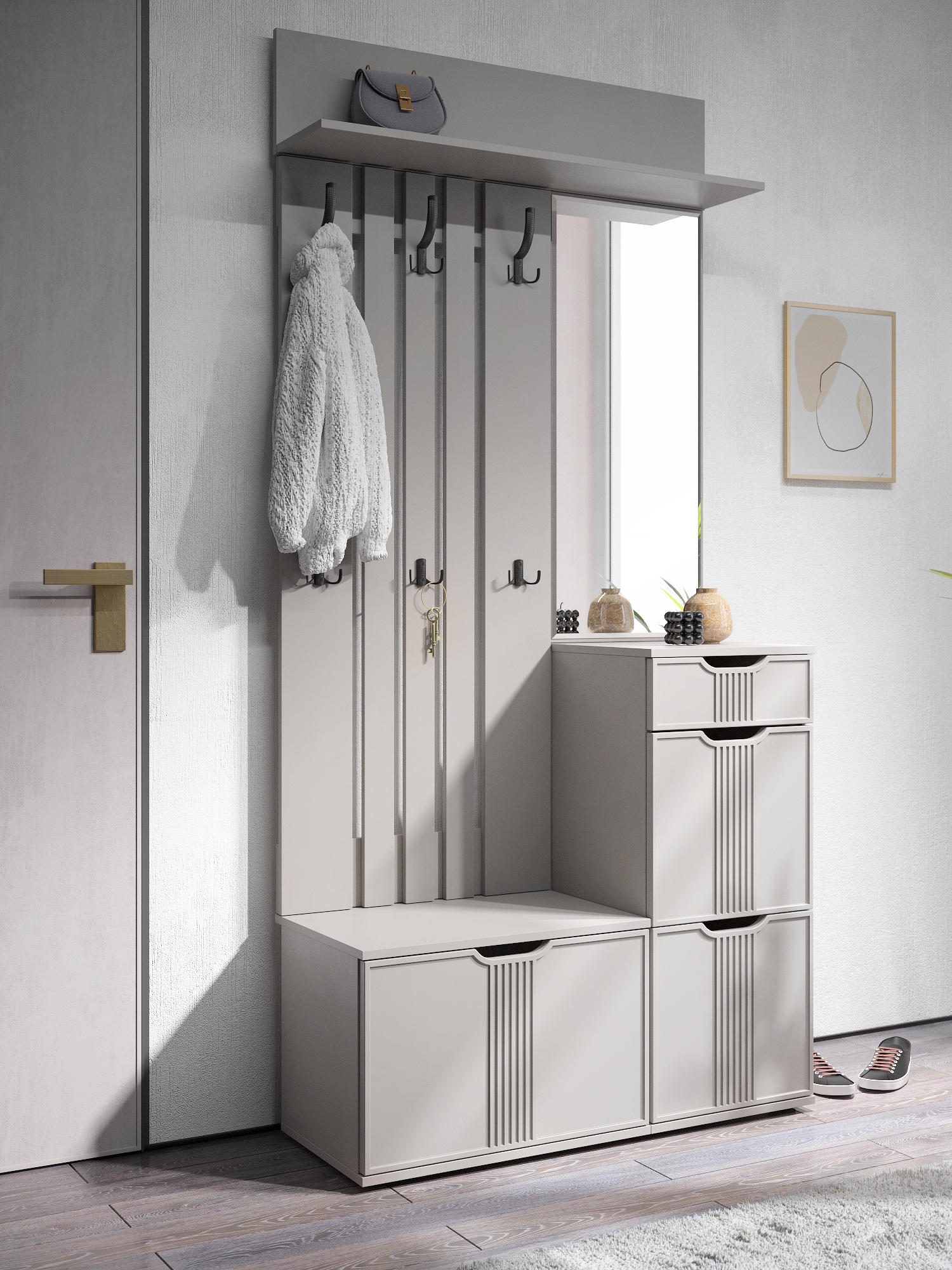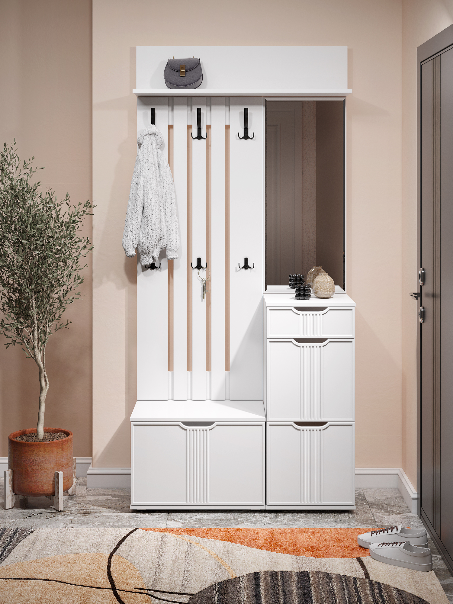 Фурнитура: петли с доводчиками, телескопические направляющие полного выдвижения без доводчиков, крючки металл. Свес крышки в 30 мм обеспечит прилегание к стене с любым плинтусом.