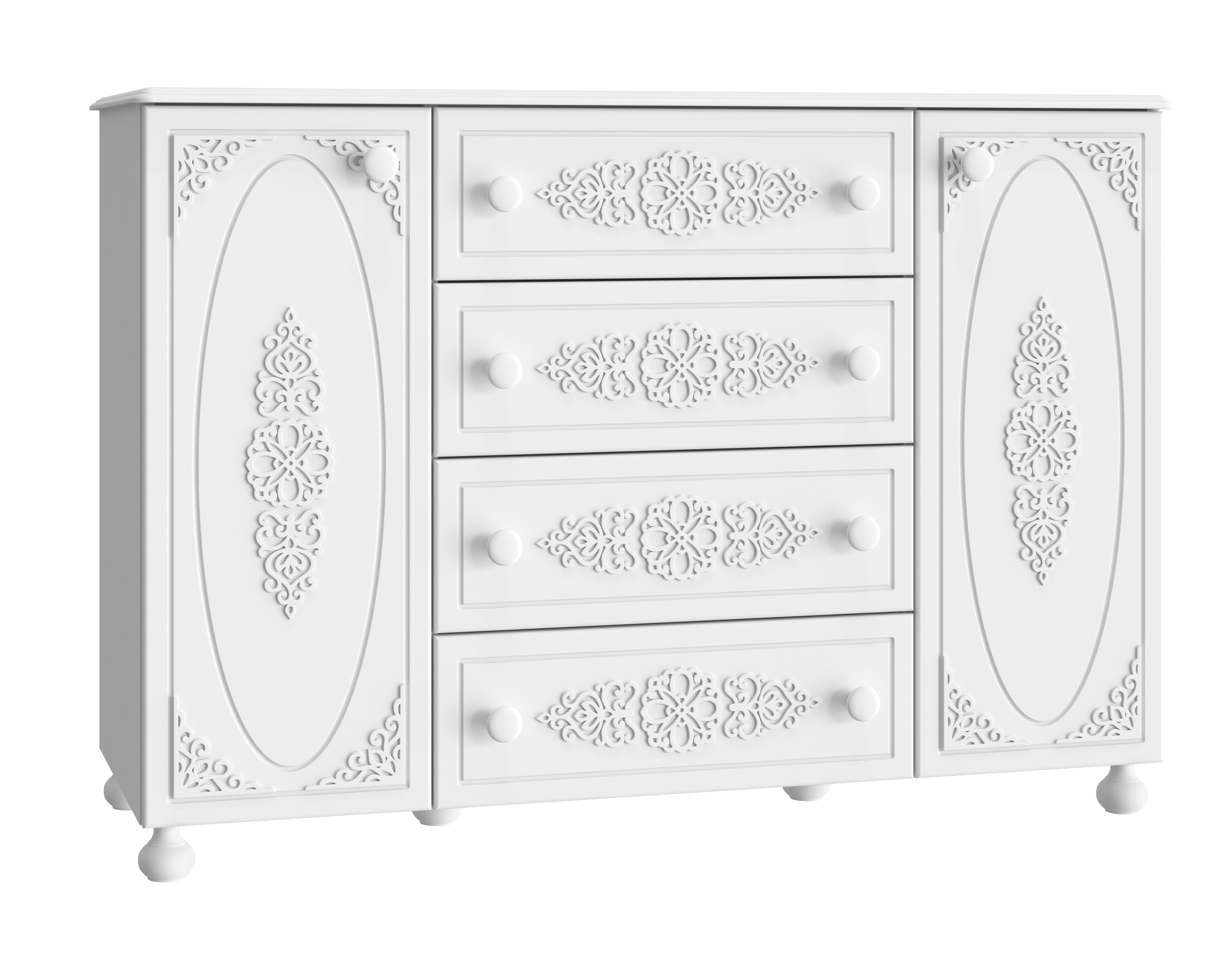 Комод АС-19 из коллекции мебели Ассоль плюс, несомненно, станет украшением Вашей гостиной или спальни. Комод оборудован посередине четырьмя вместительными выдвижными ящиками для белья и постельных аксессуаров. По бокам находятся тумбы с дверцами, за которыми по три полки. Комод установлен на ножки. Выдвижные ящики оснащены современными телескопическими направляющими, обеспечивающие плавное и бесшумное выдвижение ящиков, а на дверцах установлены петли с доводчиками. Вы можете создать самостоятельно замечательный мебельный комплект, дополнив комод зеркалом АС-38. В оформлении фасадов МДФ применяется уникальная технология нанесения объемного узора 3D. Высота опоры 65 мм. Фурнитура: петли с доводчиками, телескопические направляющие полного выдвижения без доводчиков, ручки пластик, деревянные опоры.
