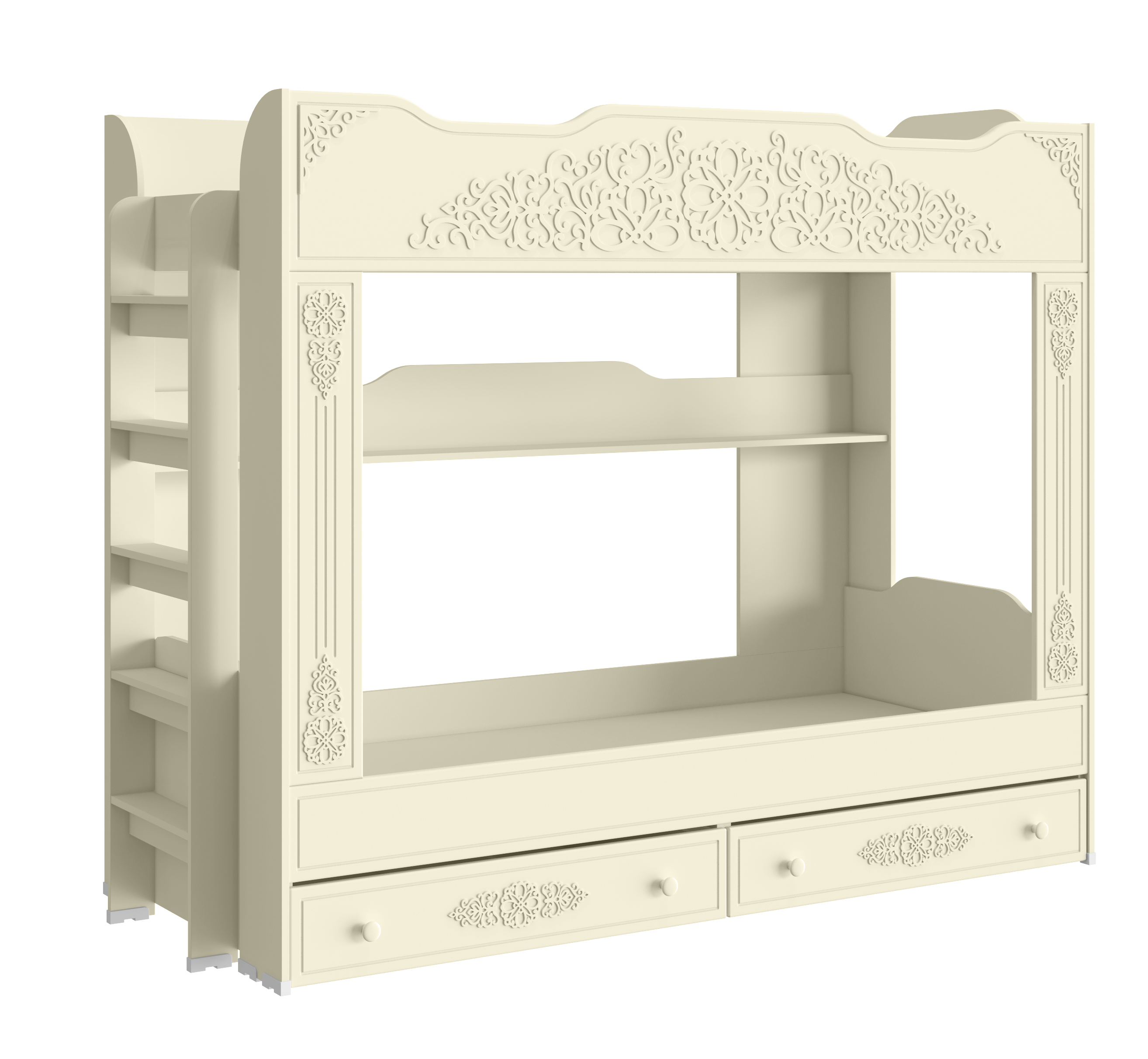 Кровать двухъярусная Ассоль плюс АС-25 превосходит по внешнему виду все обычные двухъярусные кровати. Поможет сэкономить пространство и подарит много новых возможностей своим обитателям. Практичная, надёжная и безопасная она станет не только местом для сна, а ещё и укромным уголком для чтения, отдыха и развлечений! Коллекция Ассоль плюс эксклюзивна по своему дизайну. Интересный узор, белый цвет станут мечтой ваших детей. Лестница собирается на любую сторону (переставляется изголовье). Высота изголовья верхней кровати 398 мм, защитных бортов 348 мм. Высота защитных бортов нижней кровати 186 мм. Высота лестницы 1542 мм, ширина ступеней 98 мм, ширина лестницы 428 мм. Ступени имеют дополнительное ребро жесткости. Основание кровати: настил из ЛДСП. Рекомендуемый размер матраса в мм: 900х2000х100-130. Опоры кровати имеют подпятники, предотвращающие повреждение напольного покрытия. В оформлении фасадов МДФ применяется уникальная технология нанесения объемного узора 3D.