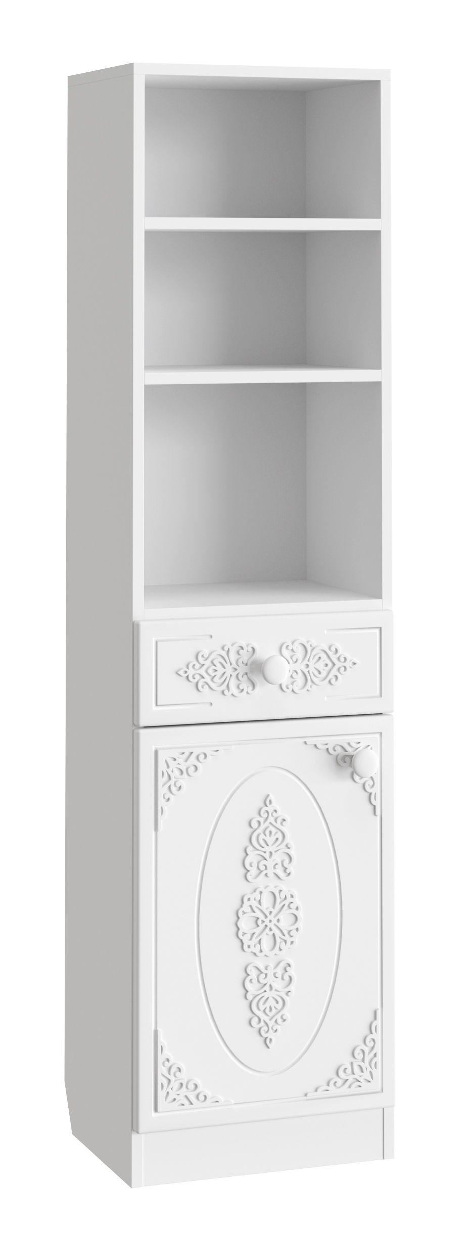 Шкаф АС-65 прекрасно дополнит ваш туалетный столик или письменный стол, создав много места для хранения книг, парфюмерии и разных аксессуаров. В оформлении фасадов МДФ применяется уникальная технология нанесения объемного узора 3D. Модуль может быть собран в зеркальном варианте "левым" или "правым". Фурнитура: петли с доводчиками, ручки пластик, телескопические направляющие полного выдвижения без доводчиков.