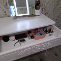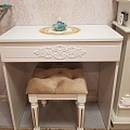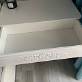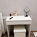 Туалетный столик ТС-15 - неотъемлемая часть спальни или женской комнаты. Каждая девочка, девушка или дама хочет иметь собственное пространство, свой уголок красоты, для того чтобы привести себя в порядок, нанести макияж, удобно и компактно расставить свою косметику и парфюмерию, аккуратно сложить украшения и аксессуары. Столик имеет один выдвижной ящик на телескопических направляющих без доводчиков. В оформлении фасадов МДФ применяется уникальная технология нанесения объемного узора 3D.