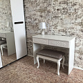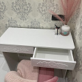 Туалетный столик ТС-25 - неотъемлемая часть спальни или женской комнаты. Каждая девочка, девушка или дама хочет иметь собственное пространство, свой уголок красоты, для того чтобы привести себя в порядок, нанести макияж, удобно и компактно расставить свою косметику и парфюмерию, аккуратно сложить украшения и аксессуары. Столик имеет два выдвижных ящика на телескопических направляющих без доводчиков. В оформлении фасадов МДФ применяется уникальная технология нанесения объемного узора 3D. Фурнитура: телескопические направляющие полного выдвижения.