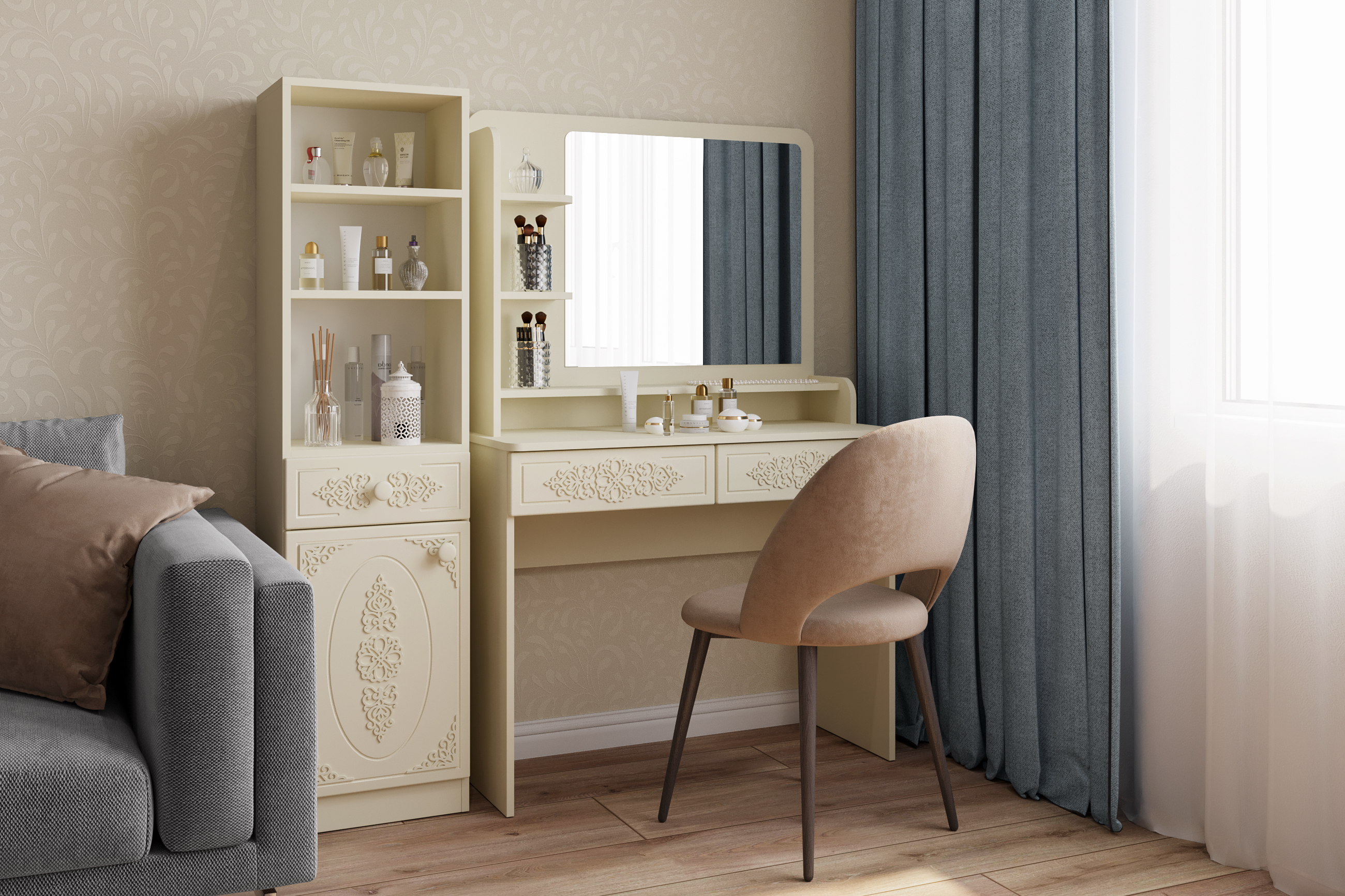 Гарнитур Ассоль плюс АС-6501 прекрасно дополнит интерьер вашей спальни, создав много места для хранения книг, парфюмерии и разных аксессуаров. Модуль АС-65 может быть собран в зеркальном варианте "левым" или "правым". Фурнитура: петли с доводчиками, ручки пластик, телескопические направляющие полного выдвижения без доводчиков. Важная информация. Мебель доставляется в разобранном виде, в упаковках.