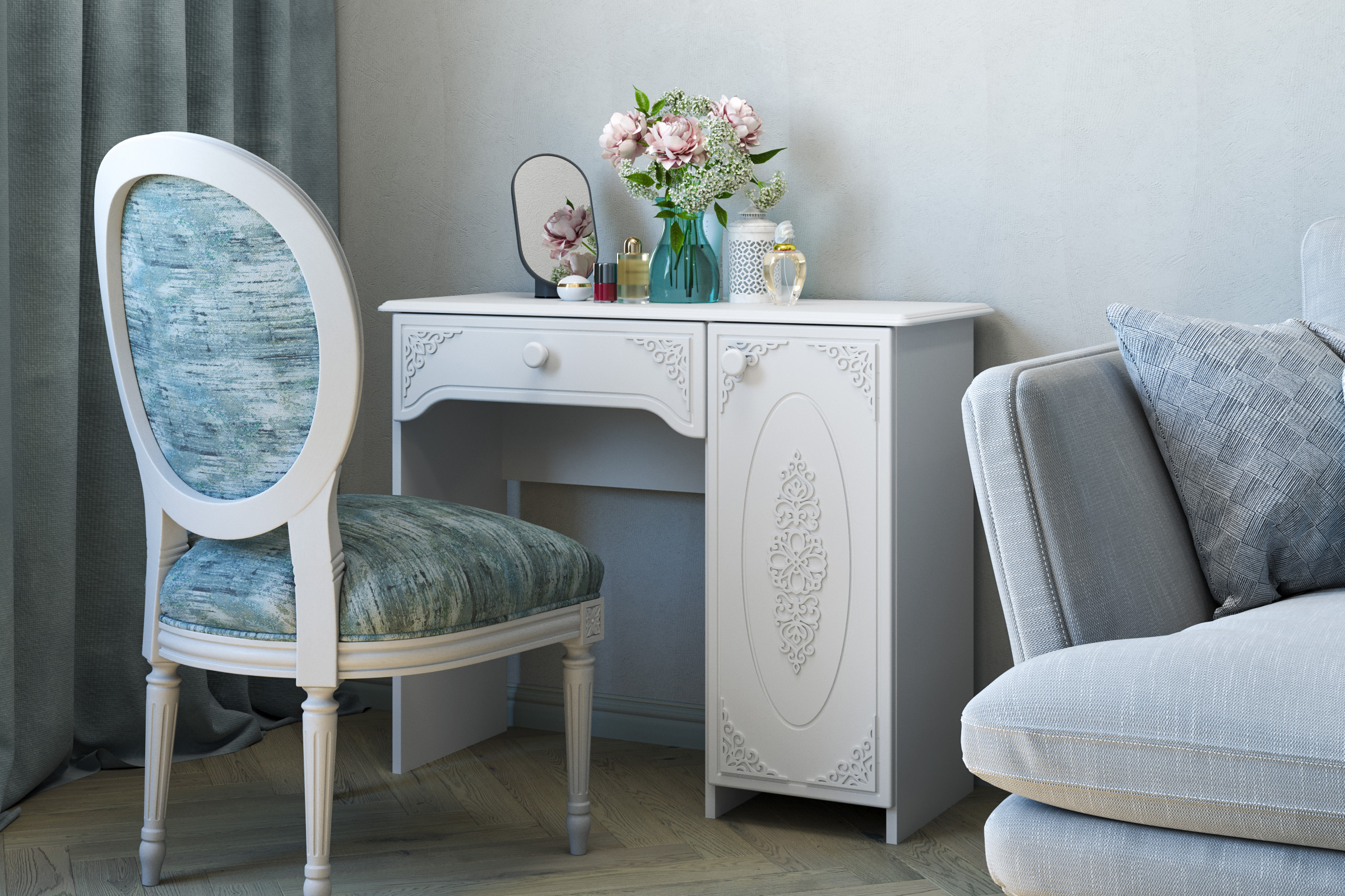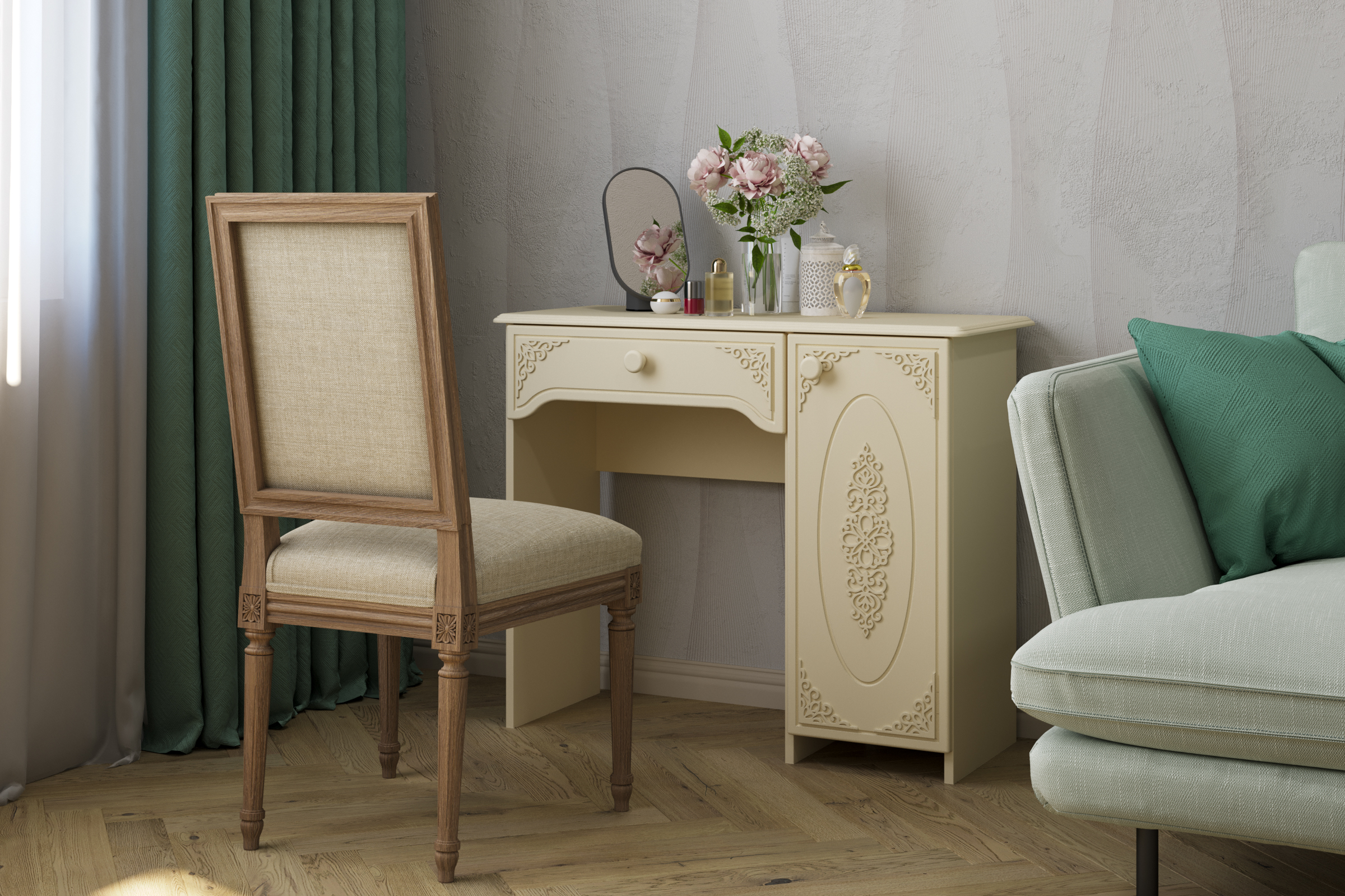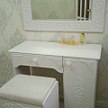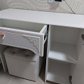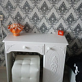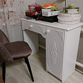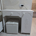 Туалетный столик ТСН-6 - неотъемлемая часть спальни или женской комнаты. Каждая девочка, девушка или дама хочет иметь собственное пространство, свой уголок красоты, для того чтобы привести себя в порядок, нанести макияж, удобно и компактно расставить свою косметику и парфюмерию, аккуратно сложить украшения и аксессуары. Столик имеет один выдвижной ящик на телескопических направляющих без доводчиков и двумя полками. Расположение тумбы только с правой стороны. Расстояние от боковины до тумбы 534 мм. Фурнитура: петли с доводчиками. Важная информация. Мебель доставляется в разобранном виде, в упаковках.