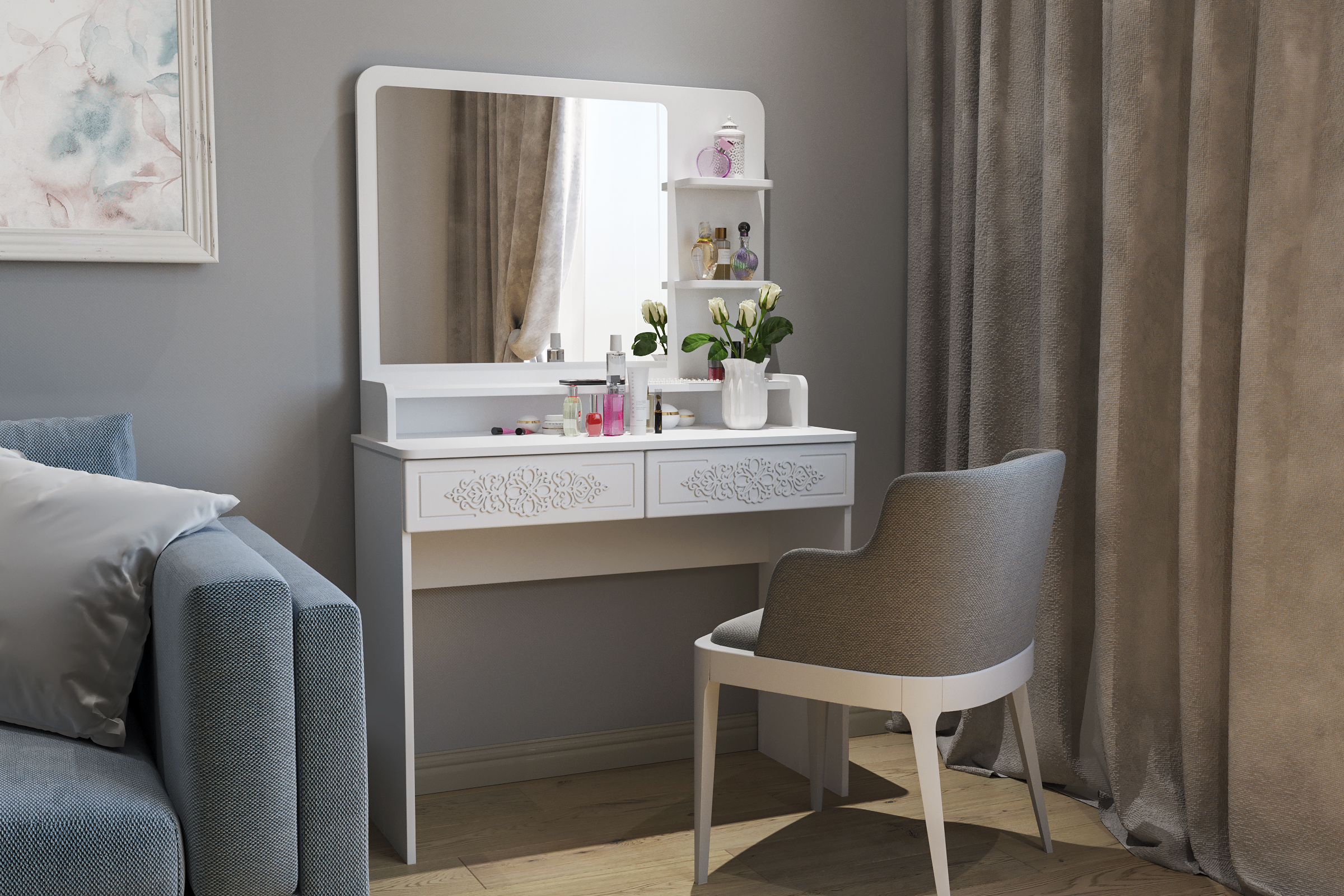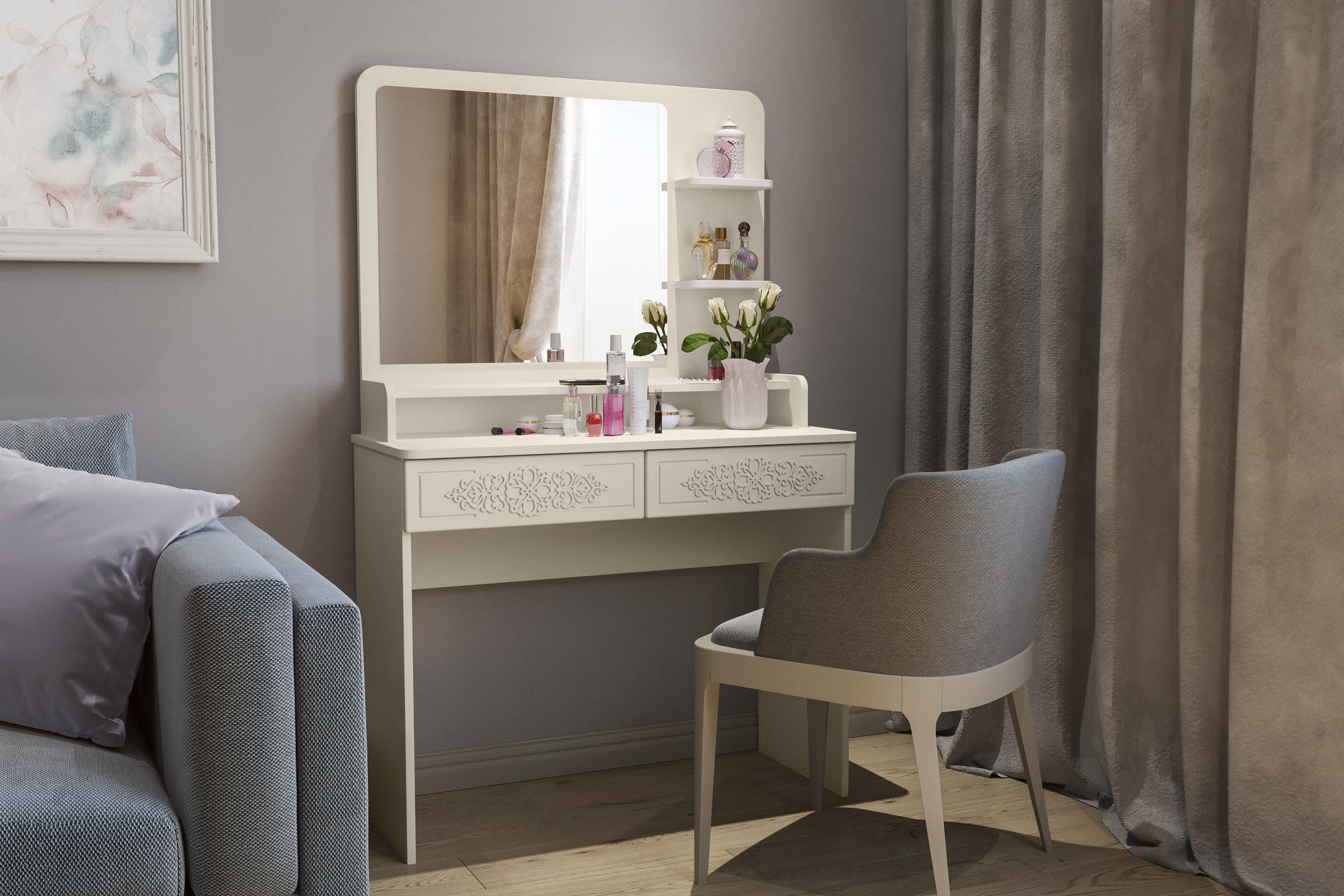 Туалетный столик ТСН-3 - неотъемлемая часть спальни или женской комнаты. Каждая девочка, девушка или дама хочет иметь собственное пространство, свой уголок красоты, для того чтобы привести себя в порядок, нанести макияж, удобно и компактно расставить свою косметику и парфюмерию, аккуратно сложить украшения и аксессуары. Столик имеет два выдвижных ящика на телескопических направляющих без доводчиков и зеркало с тремя полками. Размеры зеркала (ш/в) в мм: 630x550 мм. В оформлении фасадов МДФ применяется уникальная технология нанесения объемного узора (3D). Фурнитура: телескопические направляющие полного выдвижения без доводчиков. Важная информация. Мебель доставляется в разобранном виде, в упаковках.